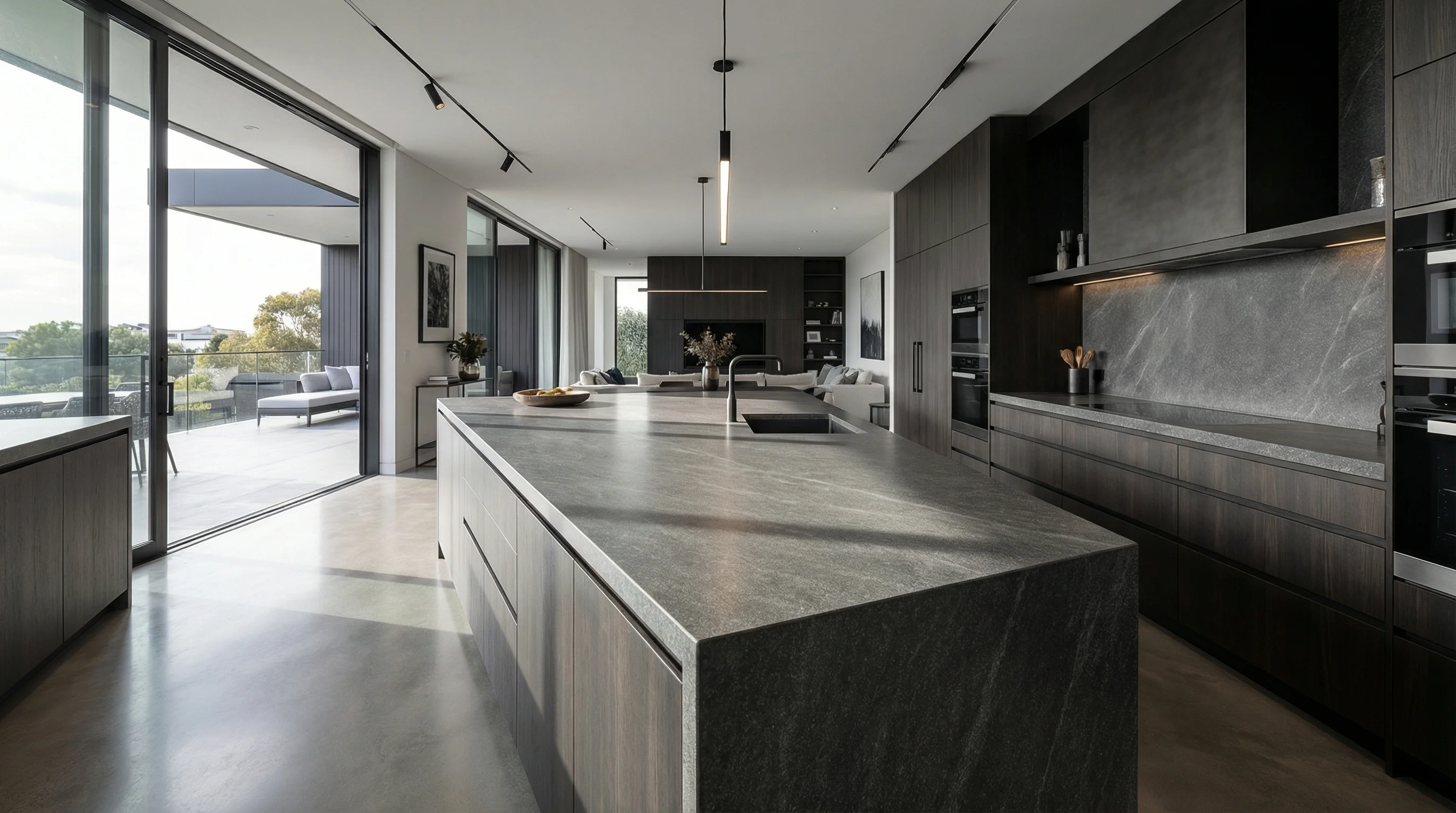 Поверхность воплощает философию сдержанной роскоши. Глубокий антрацитовый оттенок в сочетании с изысканной матовой фактурой создает визуальный объем, который тонко меняется в зависимости от сценария освещения. Это не просто функциональный элемент, а доминирующий эстетический акцент, придающий интерьеру архитектурную завершенность и благородную тишину.