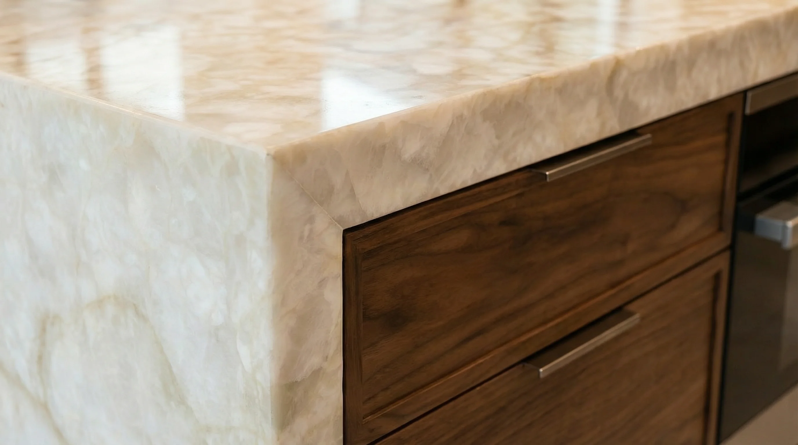 Изделие завораживает своей многослойной текстурой, в которой гармонично сплелись оттенки топленого молока, нежного крема и тонкие медовые прожилки. Глубина рисунка создает эффект мягкого внутреннего свечения, превращая рабочую плоскость в центральный элемент пространства. Такая палитра наполняет интерьер природным теплом и визуально расширяет помещение, придавая ему черты благородной эстетики и спокойной уверенности.