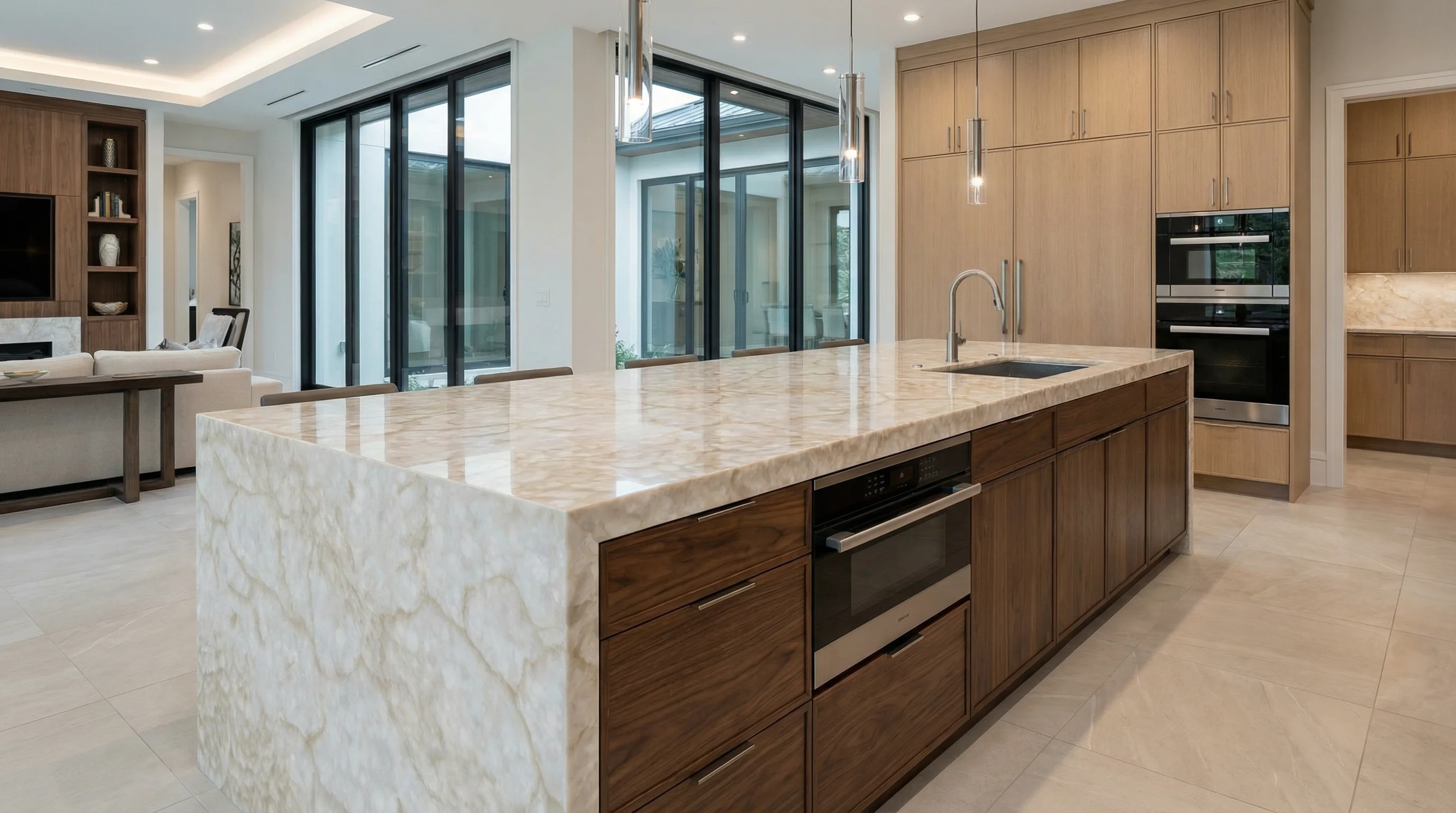 Безупречная полировка поверхности не только раскрывает богатство природного узора, но и гарантирует высочайшую стойкость к повседневным нагрузкам. Благодаря исключительной плотности материала, поверхность устойчива к влаге, случайным пятнам и температурным перепадам, сохраняя свой зеркальный блеск десятилетиями. Это идеальное сочетание тактильного удовольствия от гладкого покрытия и бескомпромиссной долговечности натурального материала.