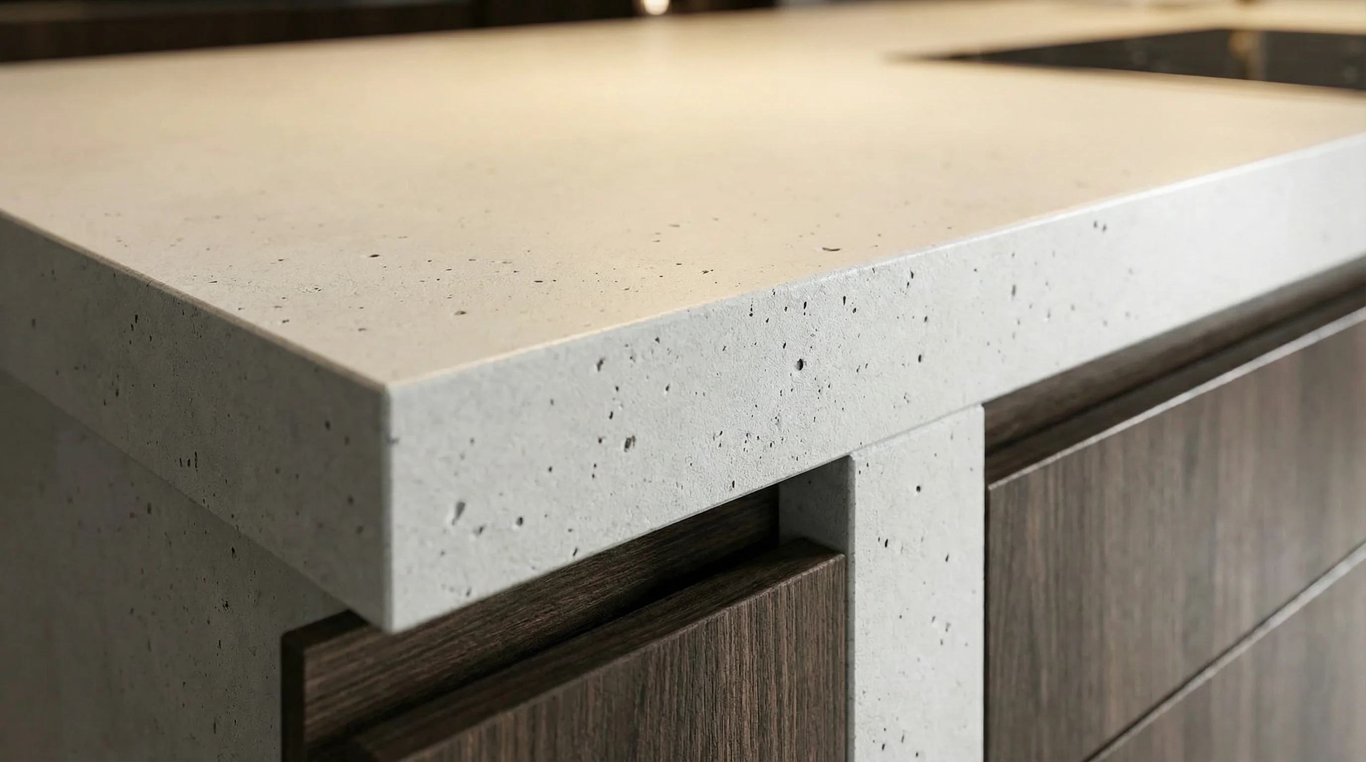 Поверхность этой столешницы представляет собой изысканное воплощение современной эстетики, выполненное из высококачественного материала с уникальным, едва заметным зернистым узором. Её спокойный, нейтральный оттенок и матовая фактура привносят в интерьер ощущение гармонии и элегантности, идеально дополняя минималистичный дизайн современной кухни.