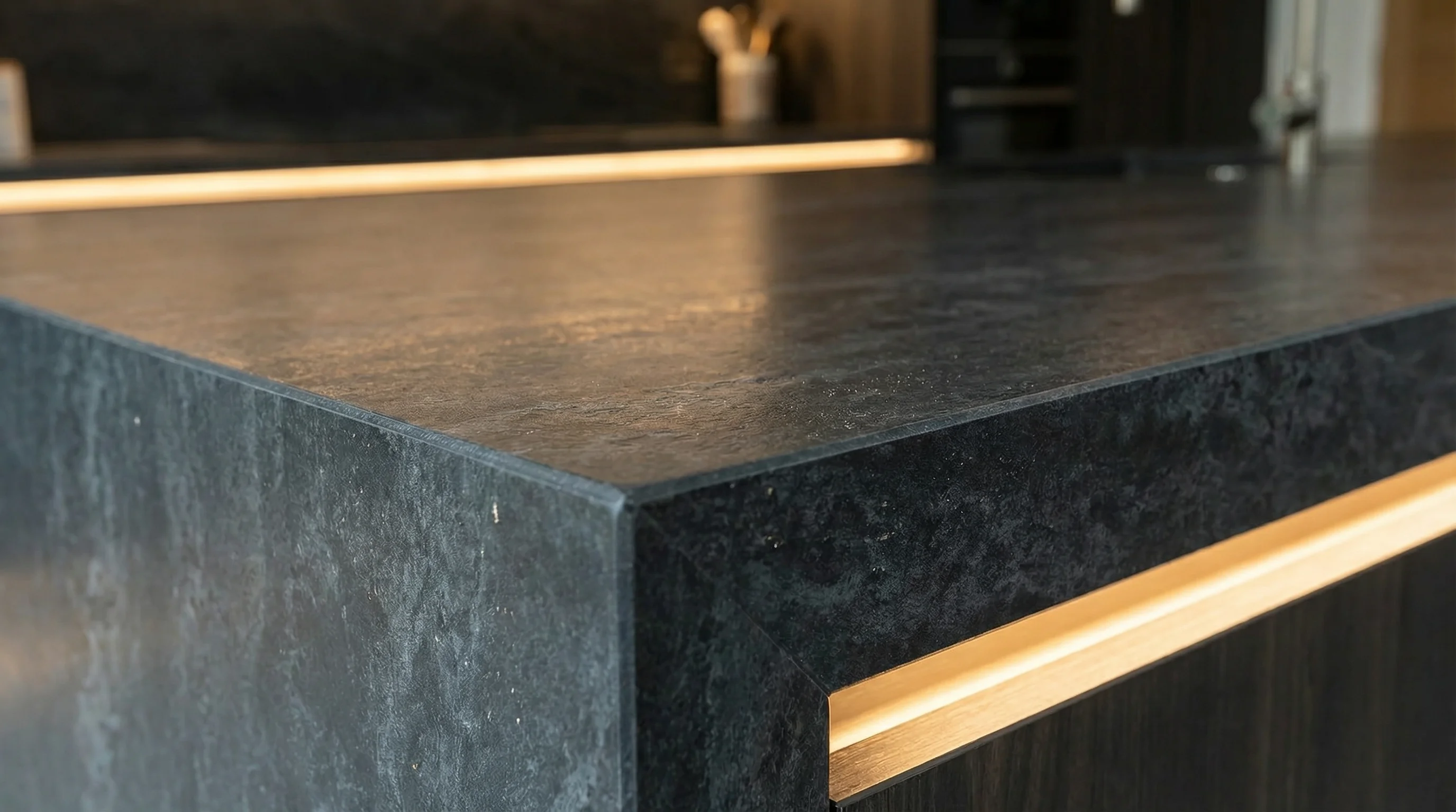 Представляем вашему вниманию эксклюзивное решение для кухонного пространства, воплощающее собой мощь и элегантность натурального камня. Поверхность материала отличается глубоким антрацитовым оттенком с деликатными прожилками и естественными включениями, создающими уникальный и неповторимый рисунок. Приятная на ощупь фактура и матовый блеск придают изделию изысканный вид, подчеркивая премиальность и современность вашего интерьера.