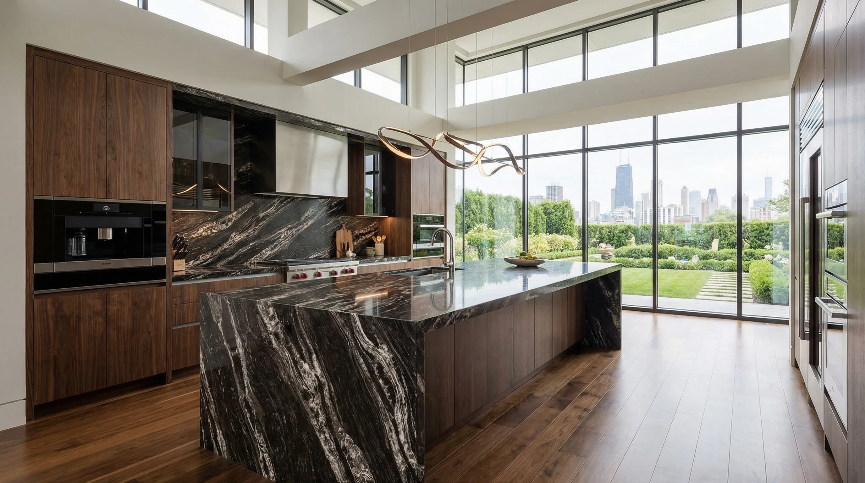 Глубокий угольный оттенок этой поверхности становится идеальным холстом для экспрессивных светлых линий, которые пронзают пространство, словно вспышки энергии в бесконечности. Уникальная фактура поверхности придает материалу благородную матовость и особенную тактильную мягкость, исключая навязчивый зеркальный блеск и подчеркивая природный рельеф. Каждый изгиб узора неповторим, что позволяет создать по-настоящему эксклюзивный интерьер с сильным характером.