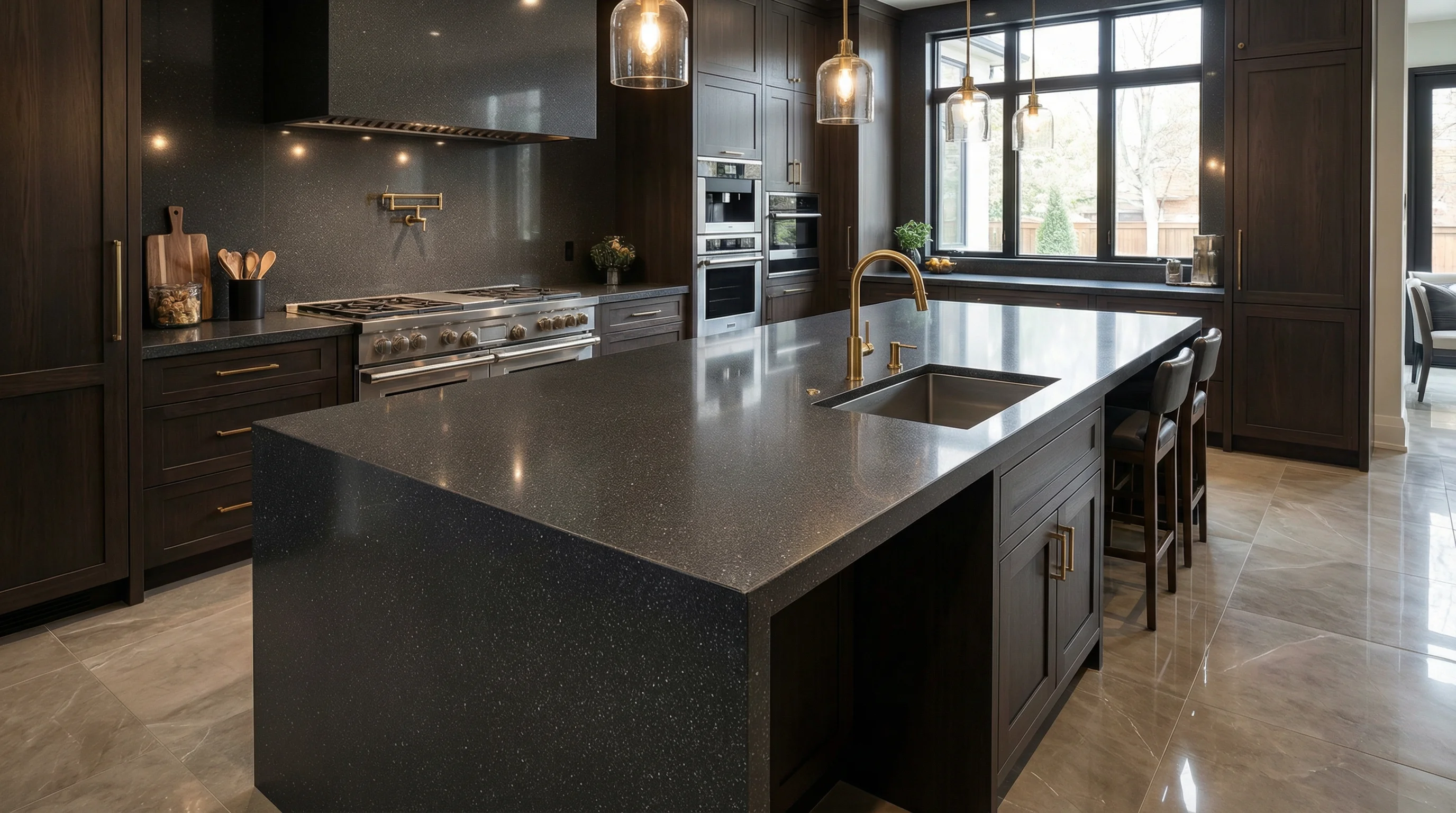 В этом изделии заложена эстетика бесконечного пространства, воплощенная в глубоком антрацитовом цвете. Насыщенная фактура оживает благодаря россыпи мельчайших кристаллических частиц, которые создают эффект тонкого, благородного мерцания при смене освещения. Такая поверхность придает интерьеру мистическую глубину и объем, становясь центром притяжения для тех, кто ценит лаконичную роскошь.