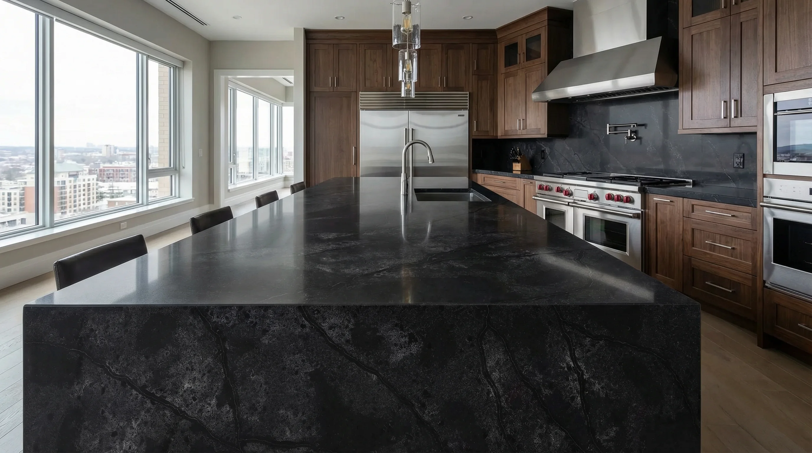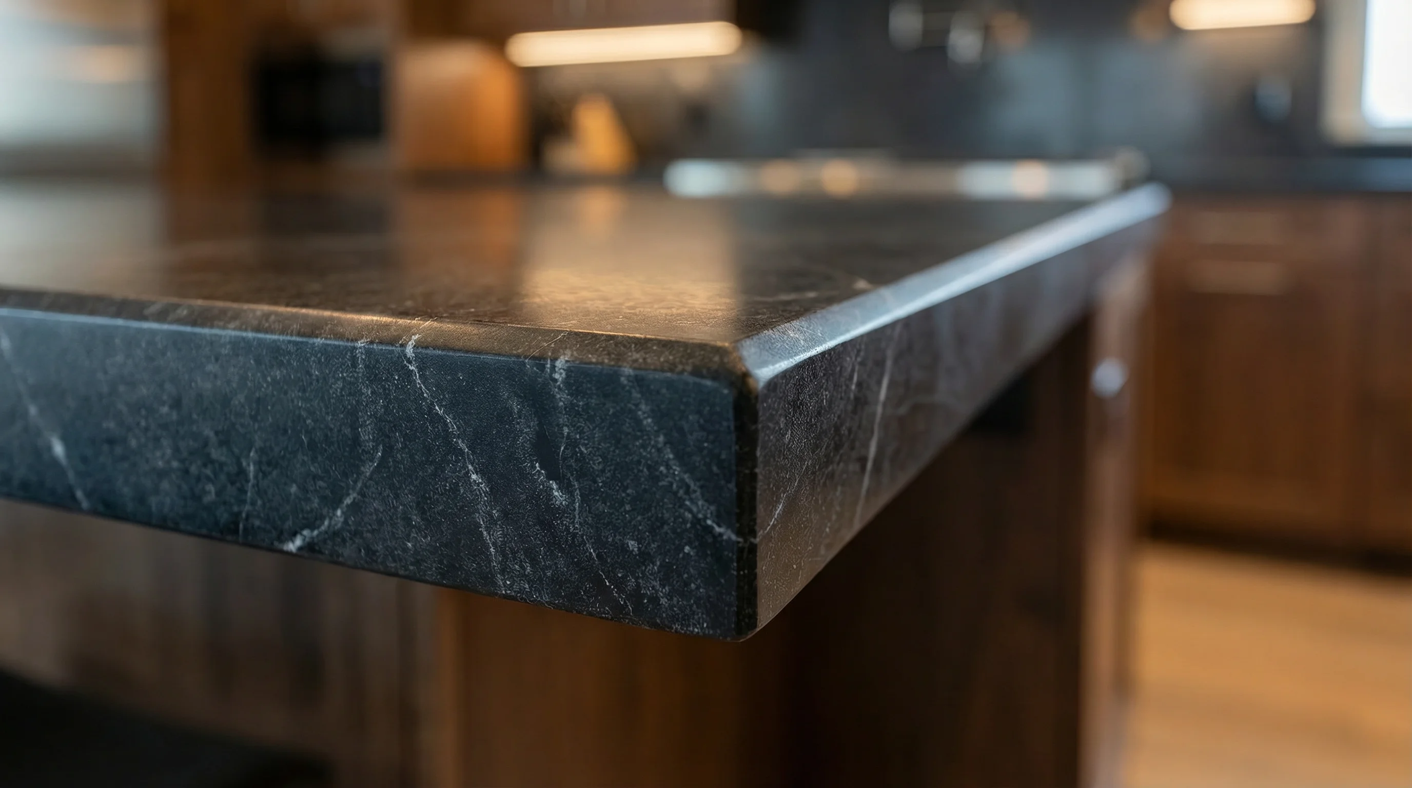 Глубокий антрацитовый оттенок с едва уловимыми, дымчатыми прожилками создает визуальный эффект бесконечного пространства. Текстура поверхности напоминает ночное небо, запечатленное в монолите, где благородный отлив подчеркивает природную сложность и многогранность рисунка, делая каждое изделие единственным в своем роде.