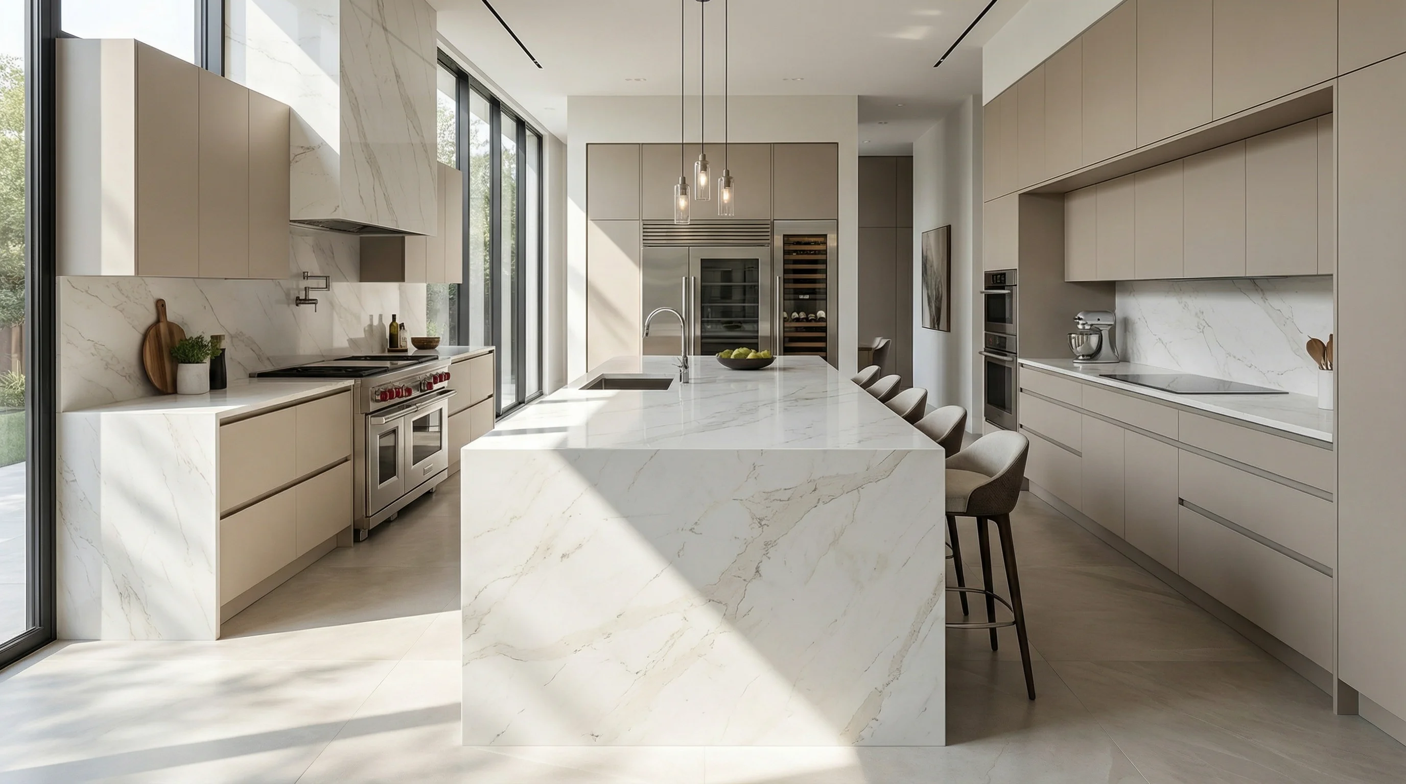 Эта изысканная поверхность станет центральным элементом вашего интерьера, привнося в него атмосферу благородства и спокойной роскоши. Ее молочно-белый фон пронизан мягкими, словно нарисованными акварелью, серыми и теплыми бежевыми прожилками. Уникальный природный узор наполняет пространство светом, визуально расширяет его и служит идеальным фоном как для минималистичного, так и для классического дизайна.