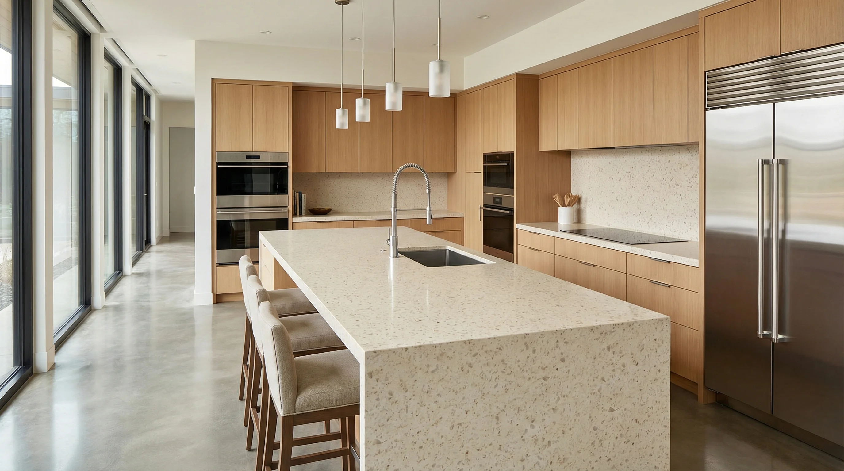 Такой выбор подчеркивает уверенный вкус и стремление к созданию гармоничной среды обитания в стиле «тихой роскоши». Материал становится естественным продолжением интерьера, мягко рассеивая свет и наполняя помещение ощущением тепла и спокойствия. Это решение для тех, кто ищет баланс между природным вдохновением и современными технологическими достижениями в архитектуре дома.
