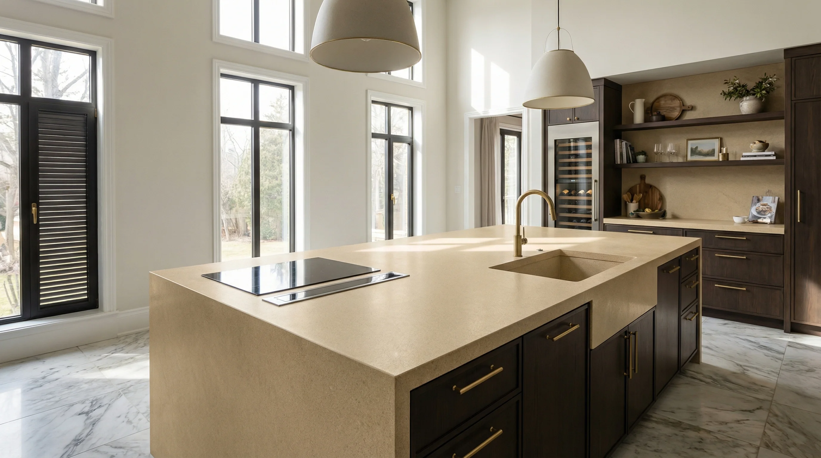 Благородный бежевый тон и матовая поверхность легко интегрируются в любое пространство, от сдержанного минимализма до современной классики. Бесшовное исполнение подчеркивает монументальность конструкции, делая ее центральным элементом дома. Это не просто функциональная поверхность, а воплощение тихой роскоши и уверенного стиля.