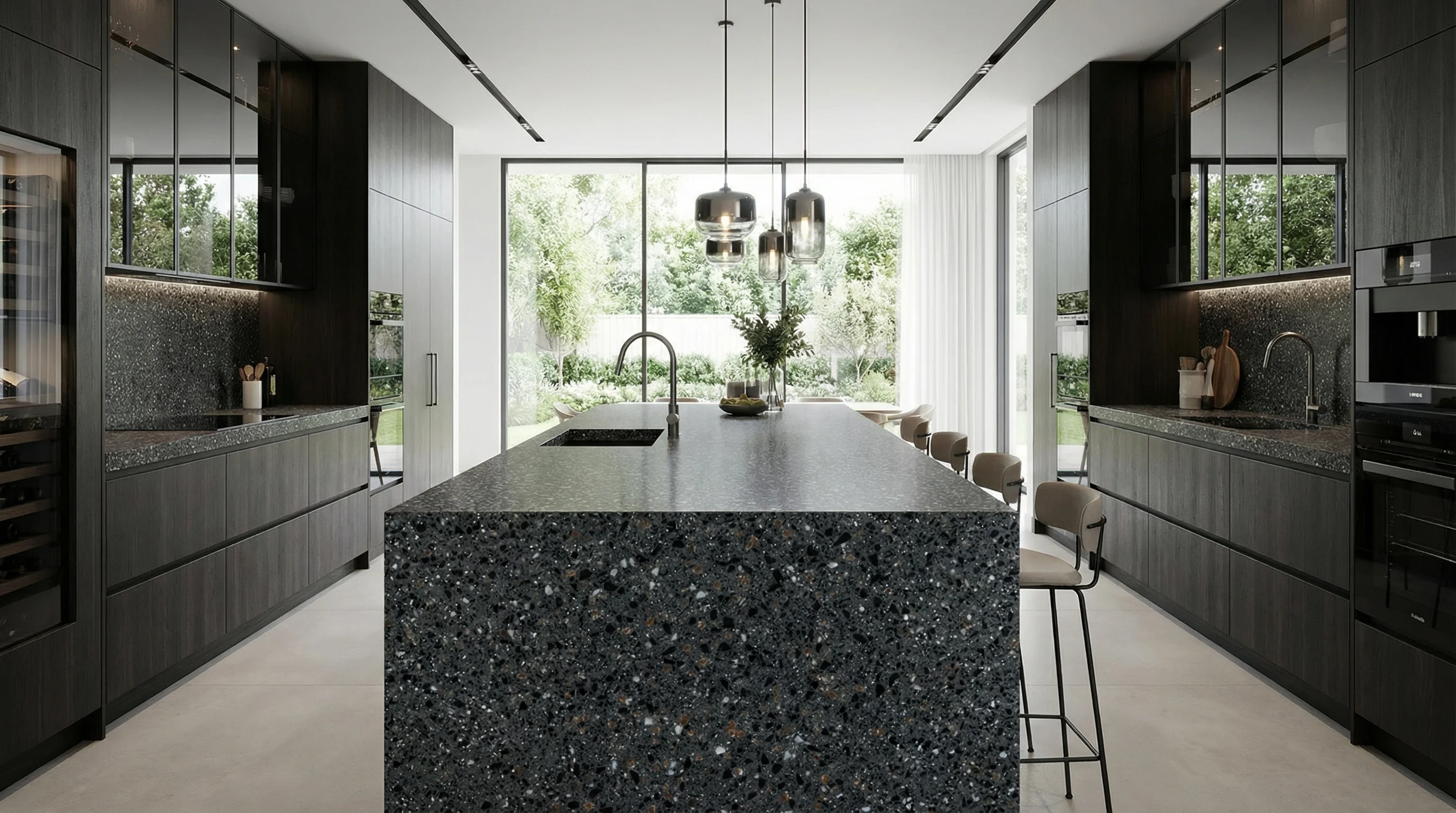 Глубокая палитра этого материала воплощает в себе сдержанную роскошь и мистическую притягательность предрассветных сумерек. Сложная текстура с деликатными включениями создает уникальный визуальный объем, который раскрывается по-новому при каждом изменении освещения. Матовая поверхность приглашает к тактильному знакомству, привнося в интерьер ощущение фундаментального спокойствия и природного благородства.