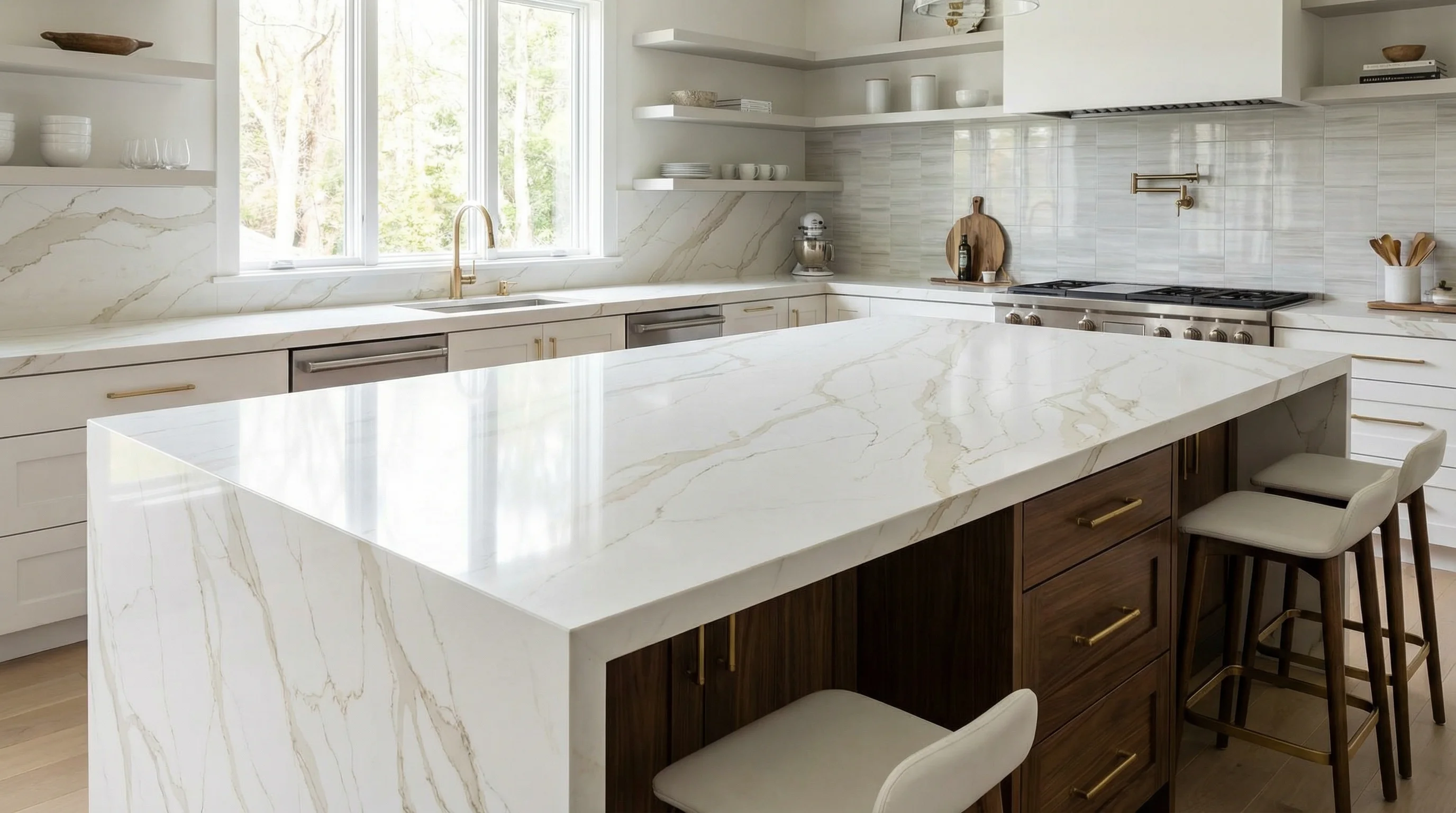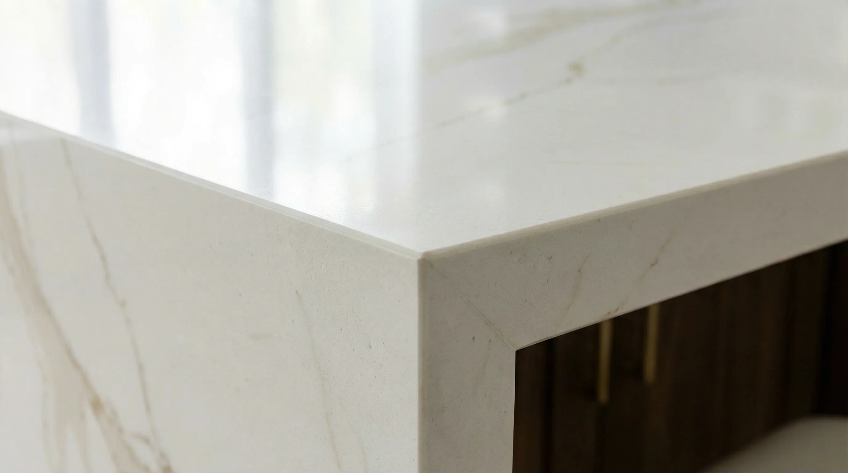 Эта премиальная поверхность воплощает в себе эстетику изысканного итальянского мрамора, добавляя интерьеру ощущение солнечного тепла и благородной роскоши. Чистый белый фон с элегантными, плавными прожилками золотистого и бежевого оттенков создает уникальный и неповторимый рисунок, который становится центральным акцентом любой кухни или ванной комнаты.