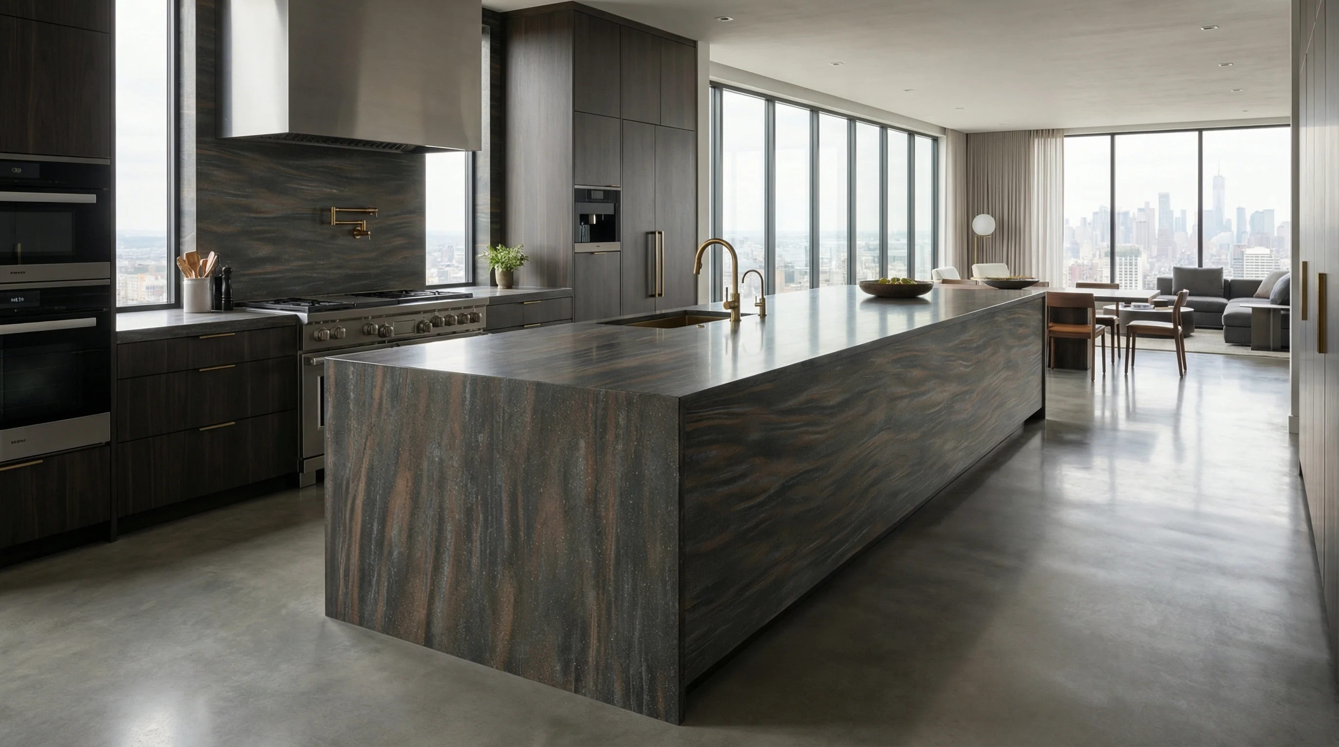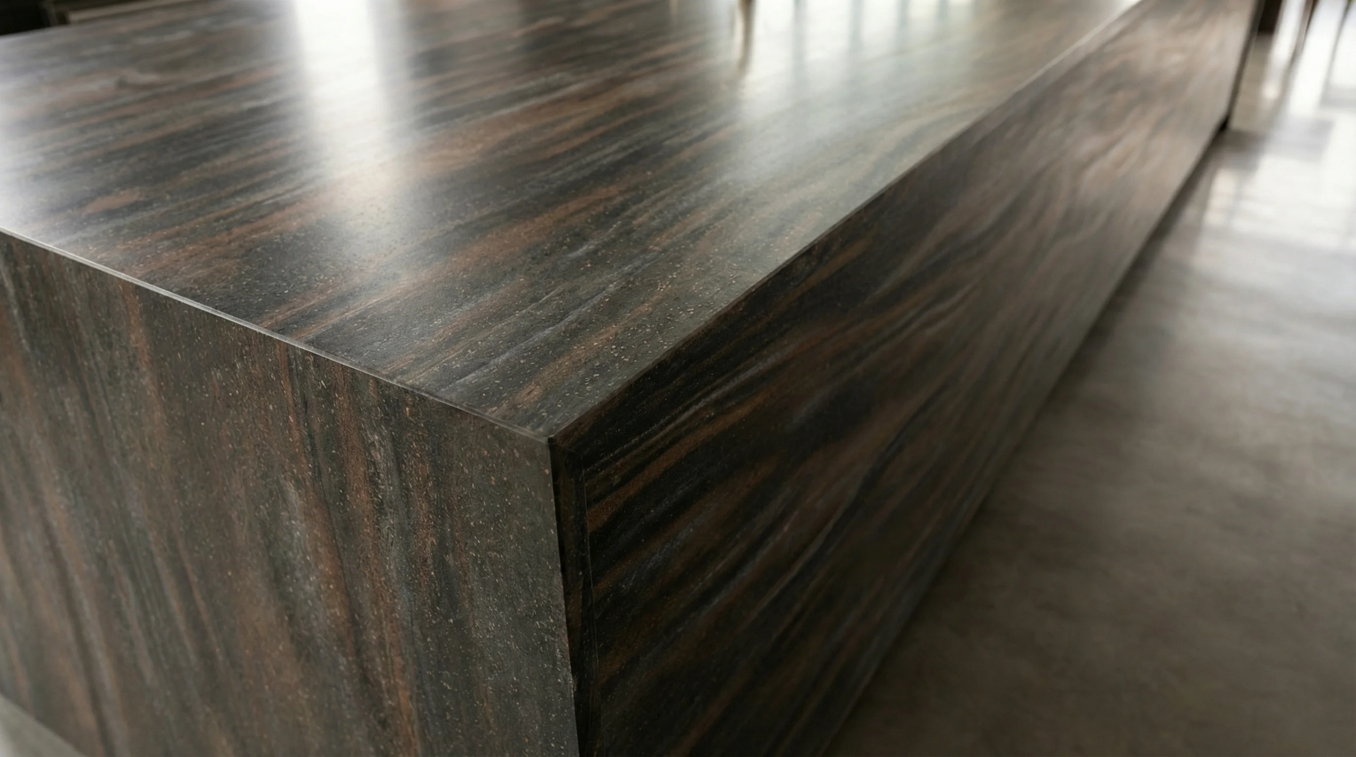 Это воплощение природной мощи, выраженное в благородной темной палитре с органичными вкраплениями теплых медных и бронзовых оттенков. Поверхность завораживает своей многогранностью: на глубоком матовом фоне проступают мягкие переливы, напоминающие движение застывшей лавы или слоистую текстуру древних скал. Каждое прикосновение к этой фактуре дарит ощущение монументальности и исключительного стиля, который остается актуальным вне зависимости от смены модных трендов.