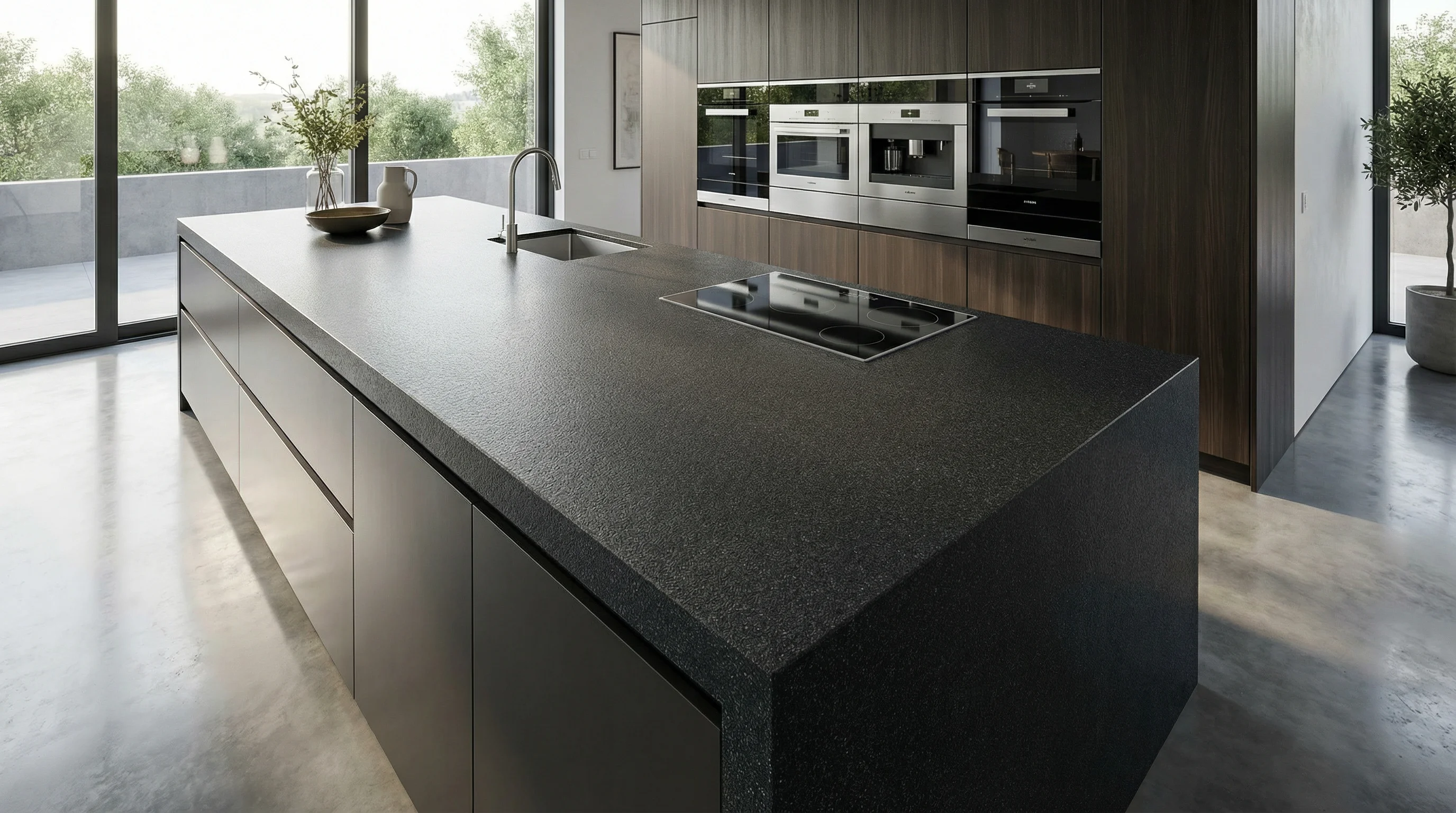 Эта поверхность воплощает в себе эстетику первозданной силы и природного спокойствия. Глубокий темный оттенок с выразительной мелкозернистой текстурой создает эффект визуальной глубины, который плавно меняется в зависимости от игры света. Матовый финиш подчеркивает благородство материала, превращая рабочую зону в подлинное произведение современного искусства.