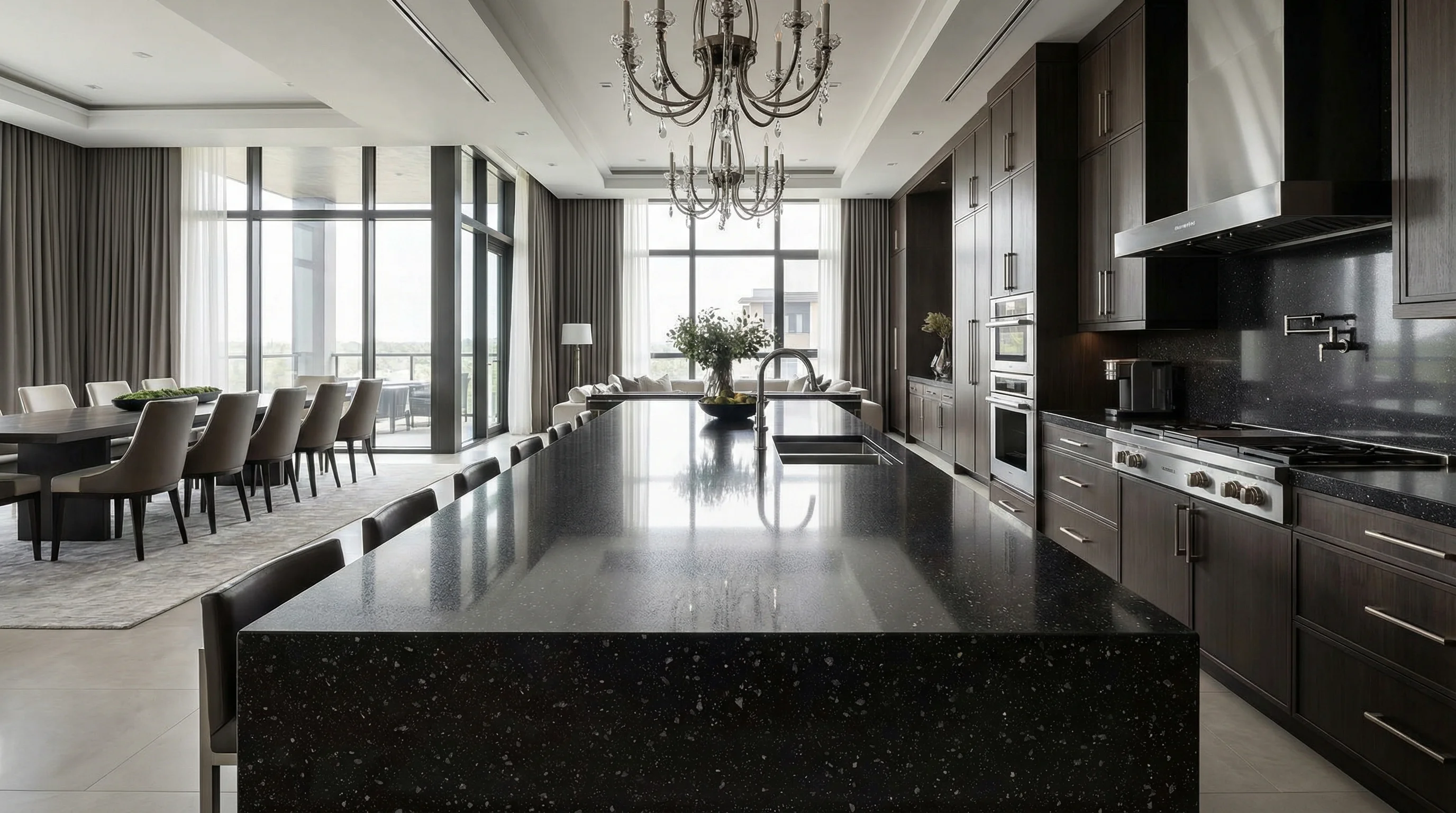 Данный акцент гармонично интегрируется в современную архитектуру дома, создавая уверенный контраст с древесными текстурами или строгими металлическими элементами. Это не просто функциональная рабочая поверхность, а визуальный центр притяжения, который объединяет пространство и привносит в него атмосферу спокойного величия и безусловного комфорта.