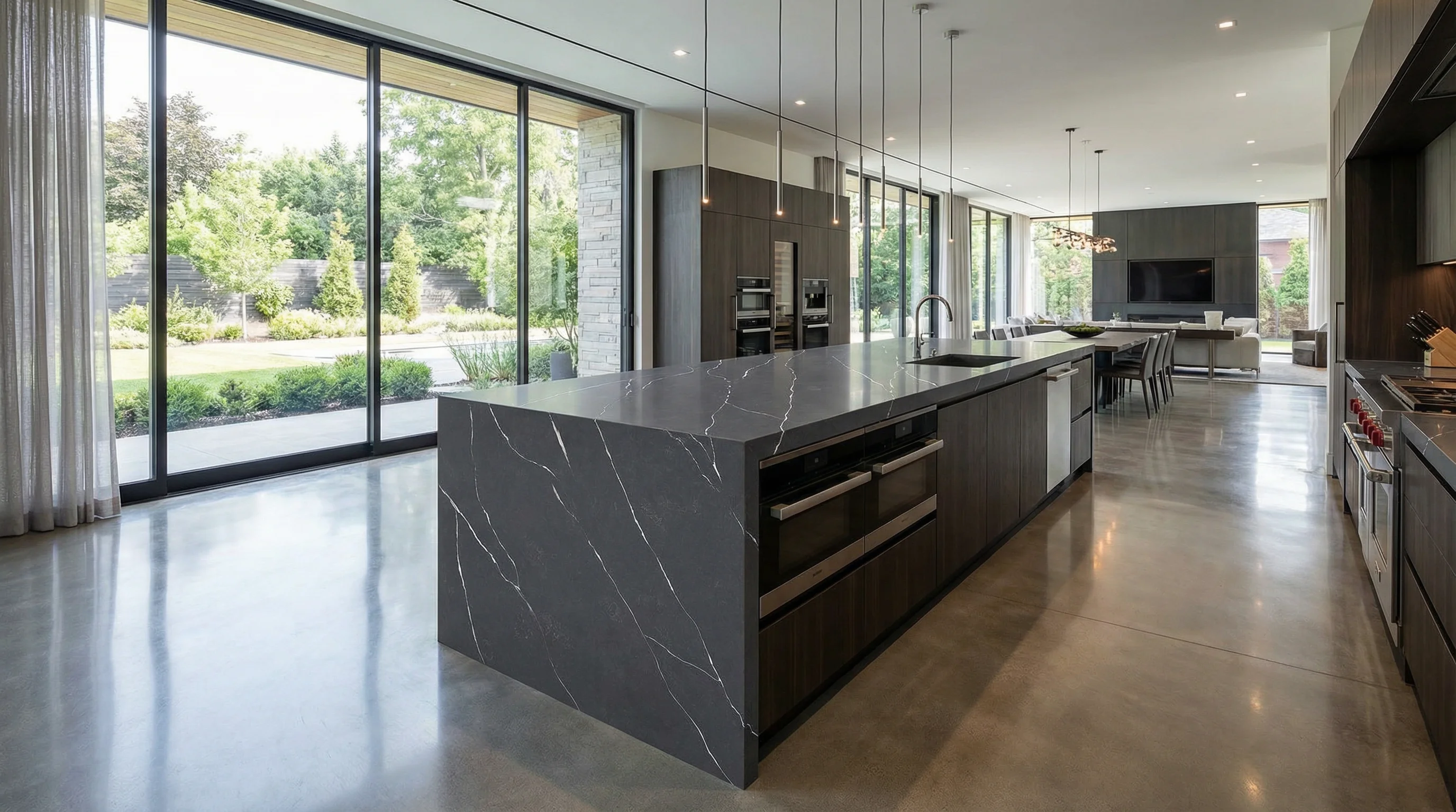 Это воплощение строгой элегантности и природной драматургии. Насыщенный угольно-серый фон пронизан тонкими, словно застывшие росчерки молний, светлыми жилами. Поверхность обладает завораживающей визуальной глубиной, создавая в интерьере атмосферу спокойной уверенности и подчеркивая безупречный вкус владельца.