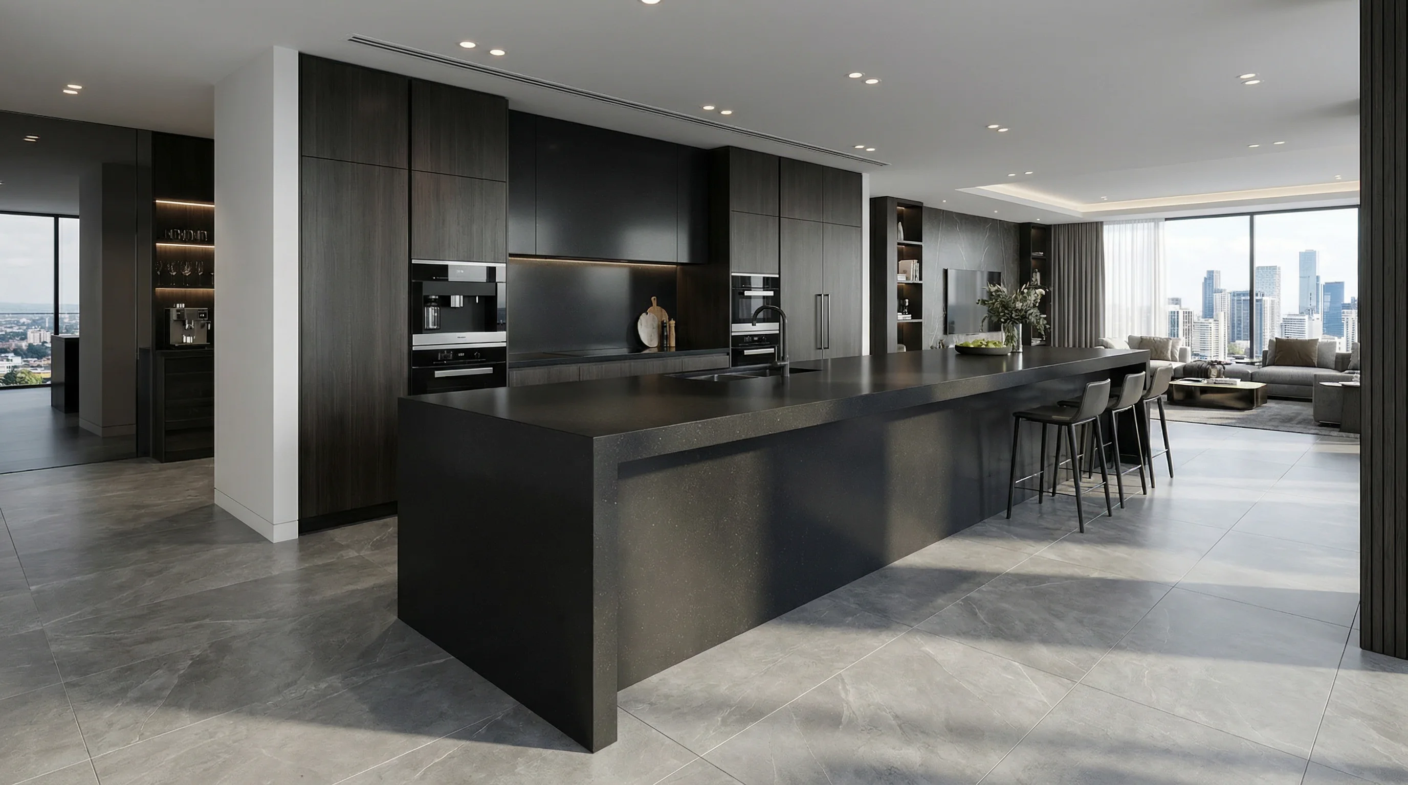 Это воплощение монументальной эстетики и природной силы, облаченное в строгую форму. Поверхность завораживает своей глубиной: на насыщенном темном фоне проступают едва уловимые переплетения текстур, напоминающие ночной лес в свете луны. Матовая фактура подчеркивает благородство материала, делая каждое прикосновение к нему тактильно приятным и оставляя ощущение абсолютного спокойствия и уверенности.