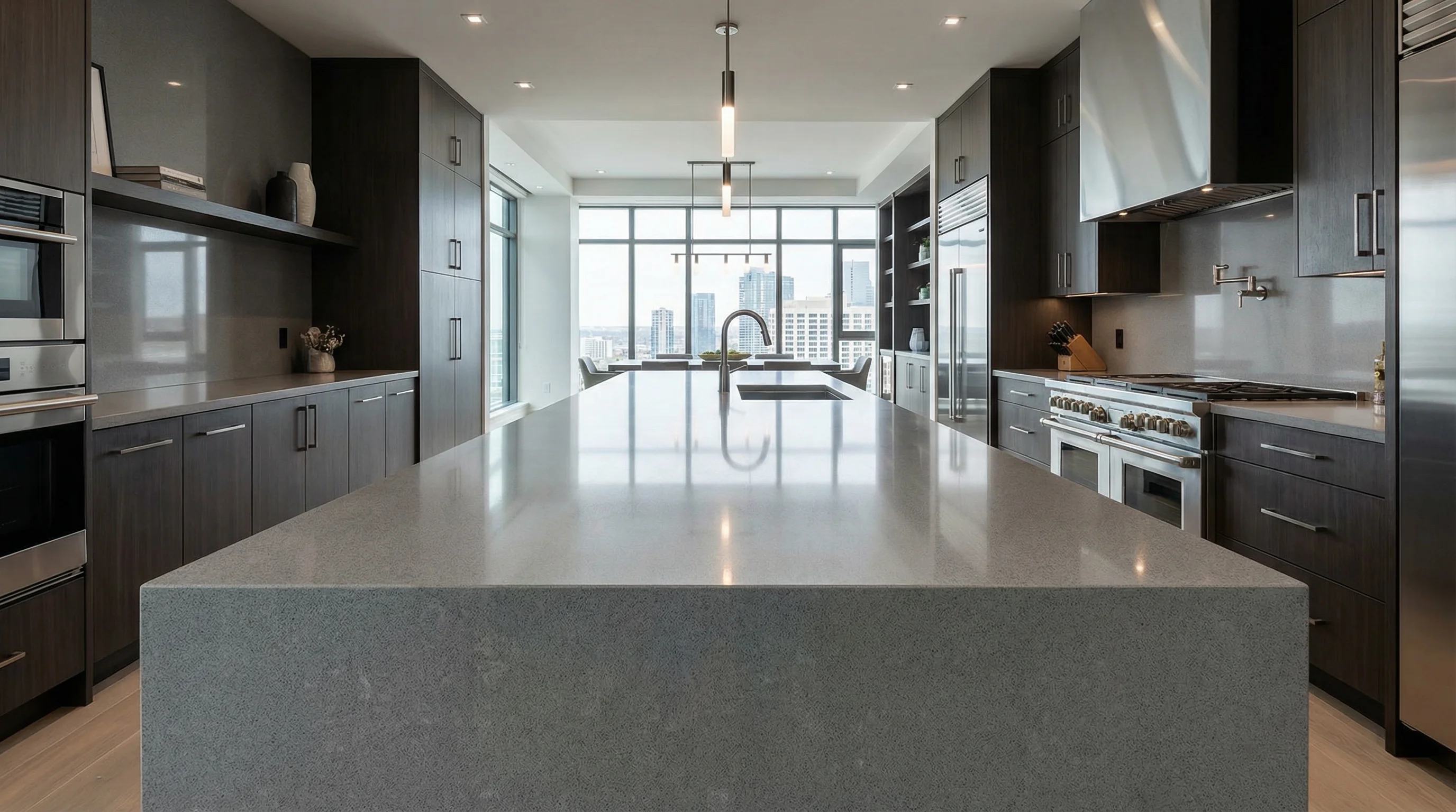 Это воплощение современной эстетики в её самом чистом проявлении. Глубокий серый оттенок, вдохновленный индустриальным минимализмом, переносит в интерьер спокойствие мегаполиса в предрассветных сумерках. Благородная фактура и мягкий матовый отблеск создают безупречный фон для кулинарного творчества, наполняя пространство атмосферой уверенности и безукоризненного вкуса.