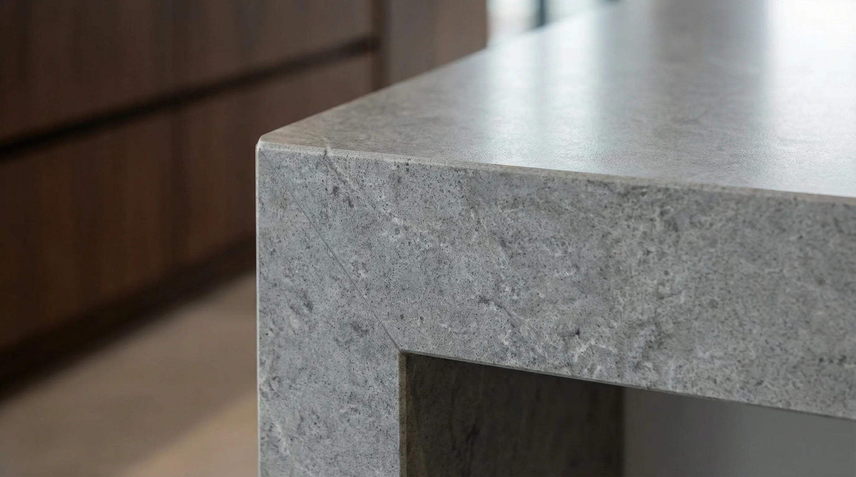 Эта столешница воплощает собой философию сдержанной роскоши и монументального спокойствия. Ее поверхность отличается глубоким, благородным серым оттенком с едва уловимым природным рисунком, напоминающим застывшую в камне горную дымку. Матовая фактура материала приглушает блики, придавая интерьеру кухни атмосферу статусного уюта и делая изделие центральным элементом пространства, притягивающим взгляды.