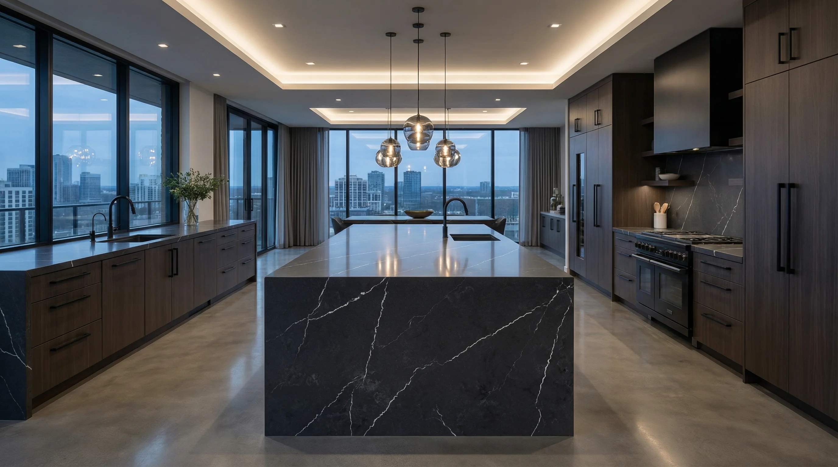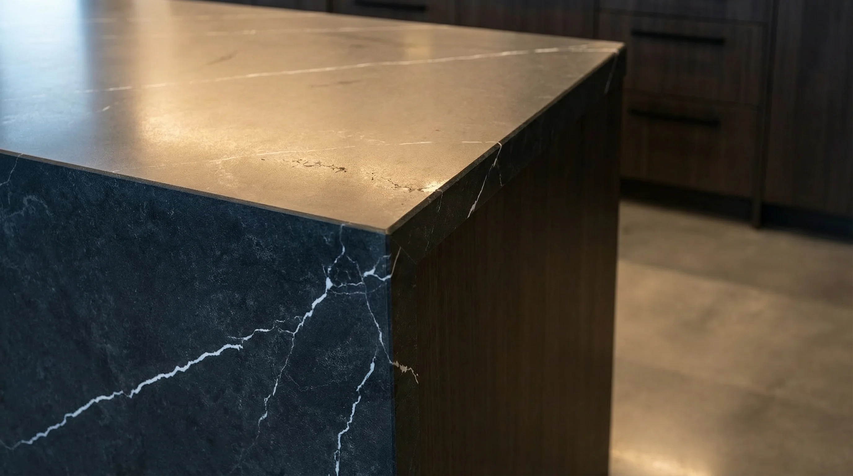 Глубокий антрацитовый оттенок этого изделия воссоздает атмосферу затаенной природной силы и элегантной строгости. Текстура завораживает своей многослойностью: на насыщенном темном фоне проступают тонкие светлые прожилки, напоминающие росчерки молний в сумерках. Такое сочетание придает пространству визуальную монументальность и подчеркивает изысканную архитектуру интерьера, превращая рабочую зону в настоящее произведение современного искусства.