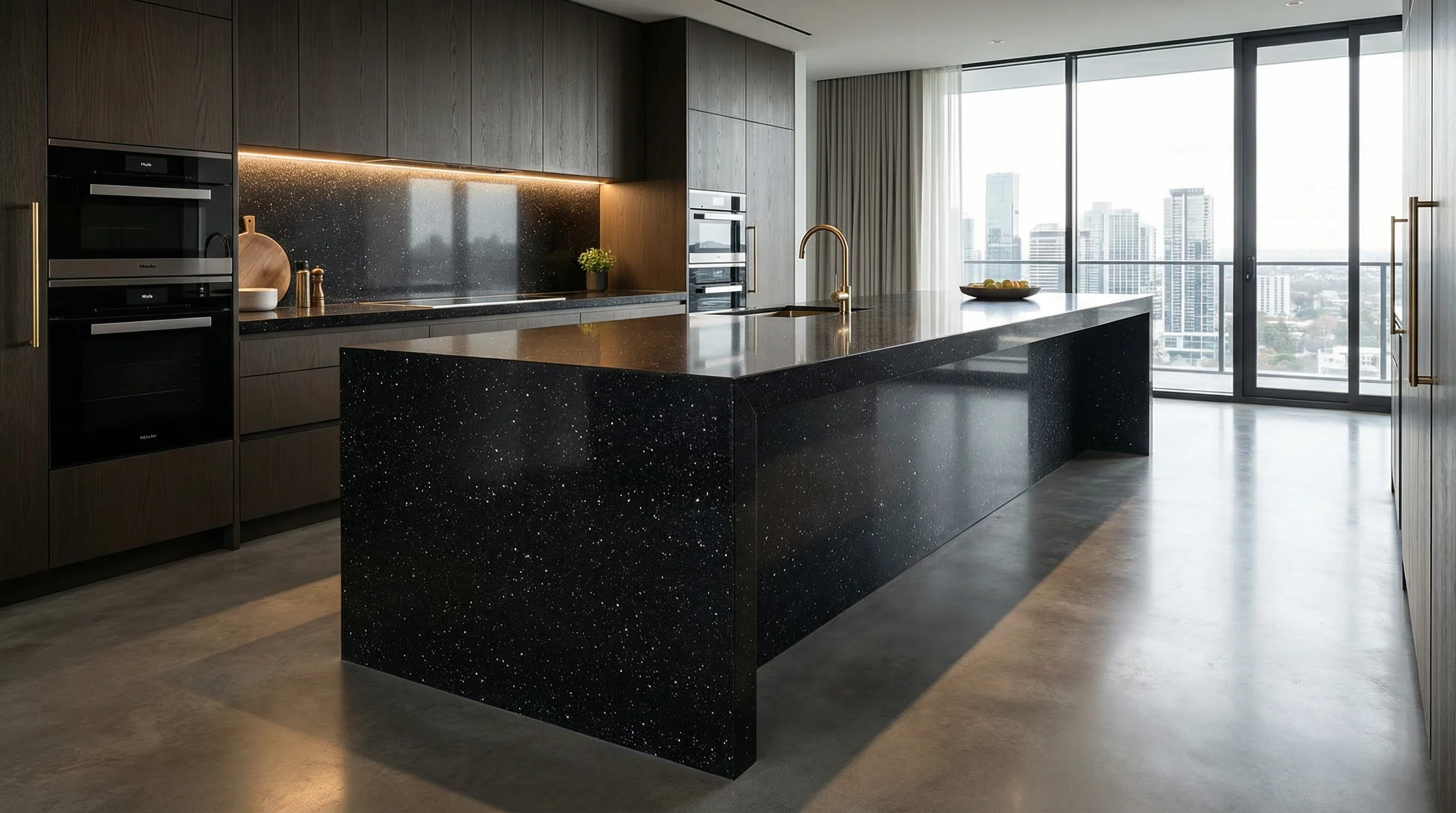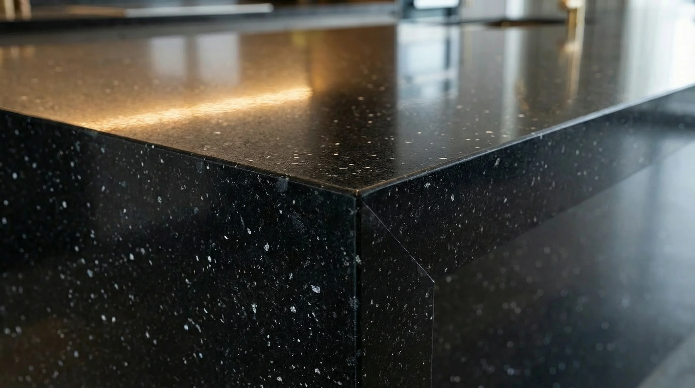 Эта исключительная поверхность воплощает в себе глубину и тайну ночного неба. Насыщенный черный фон густо усыпан мельчайшими сияющими вкраплениями, создающими эффект бесконечного звездного мерцания. Зеркальная полировка усиливает этот космический эффект, придавая интерьеру ощущение роскоши и монументальной элегантности.