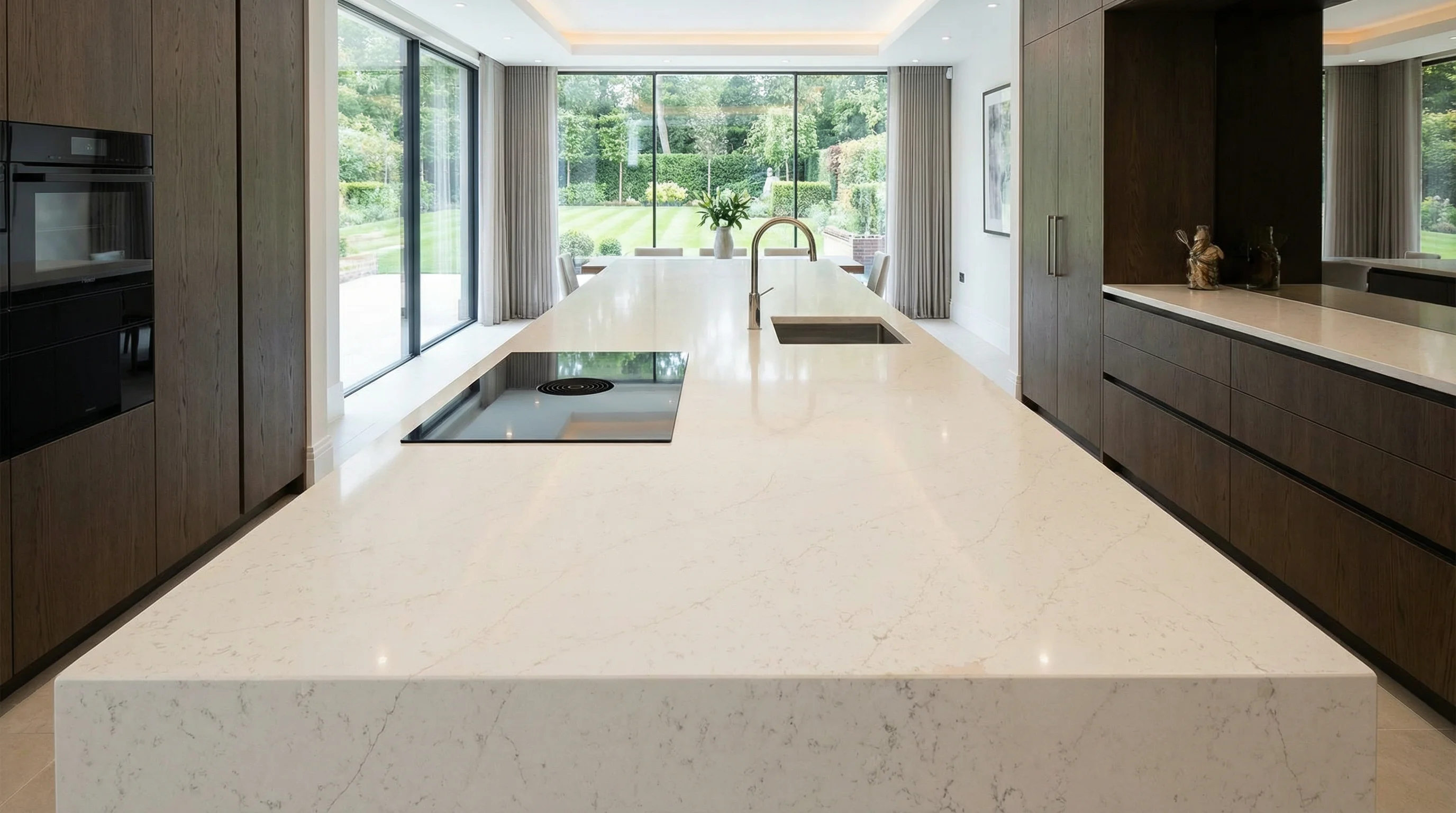 Эта поверхность воплощает в себе эстетику безупречной чистоты и утонченности. Нежный молочный фон с едва уловимыми, хаотично переплетающимися прожилками создает эффект визуальной глубины, превращая рабочую зону в центральный элемент интерьера. Благодаря своей светлой палитре, изделие наполняет пространство воздухом и мягким сиянием, идеально дополняя как минималистичные, так и классические дизайнерские решения.