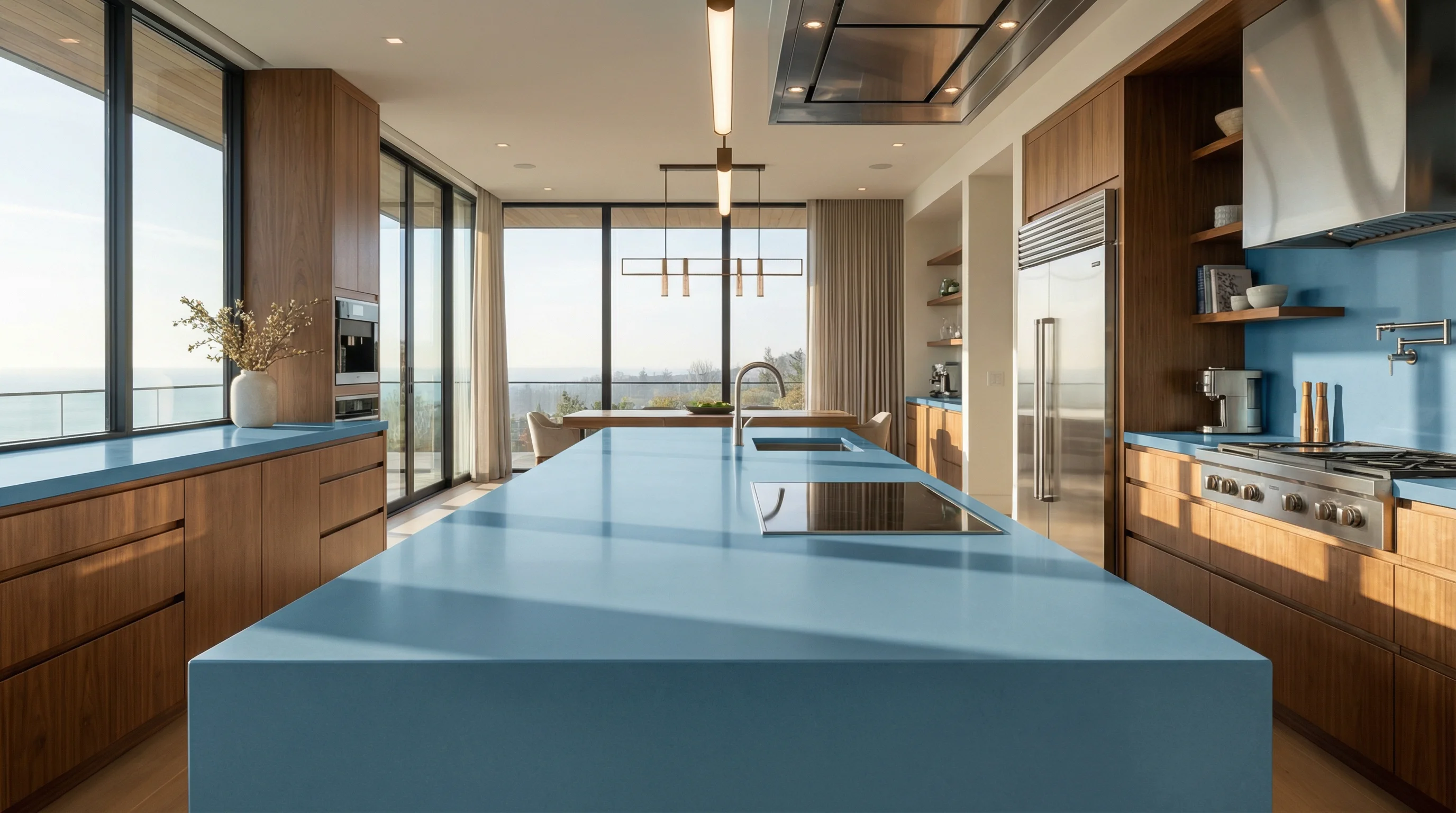 Откройте для себя новое измерение стиля с этой уникальной рабочей поверхностью из искусственного камня, выполненной в насыщенном, однотонном голубом оттенке. Ее глубокий, спокойный цвет мгновенно притягивает взгляд, привнося в интерьер кухни ощущение безмятежности и утонченной элегантности. Идеально гладкая поверхность камня напоминает спокойные воды океана, становясь центральным элементом дизайна, который подчеркивает современный и взыскательный вкус владельца.