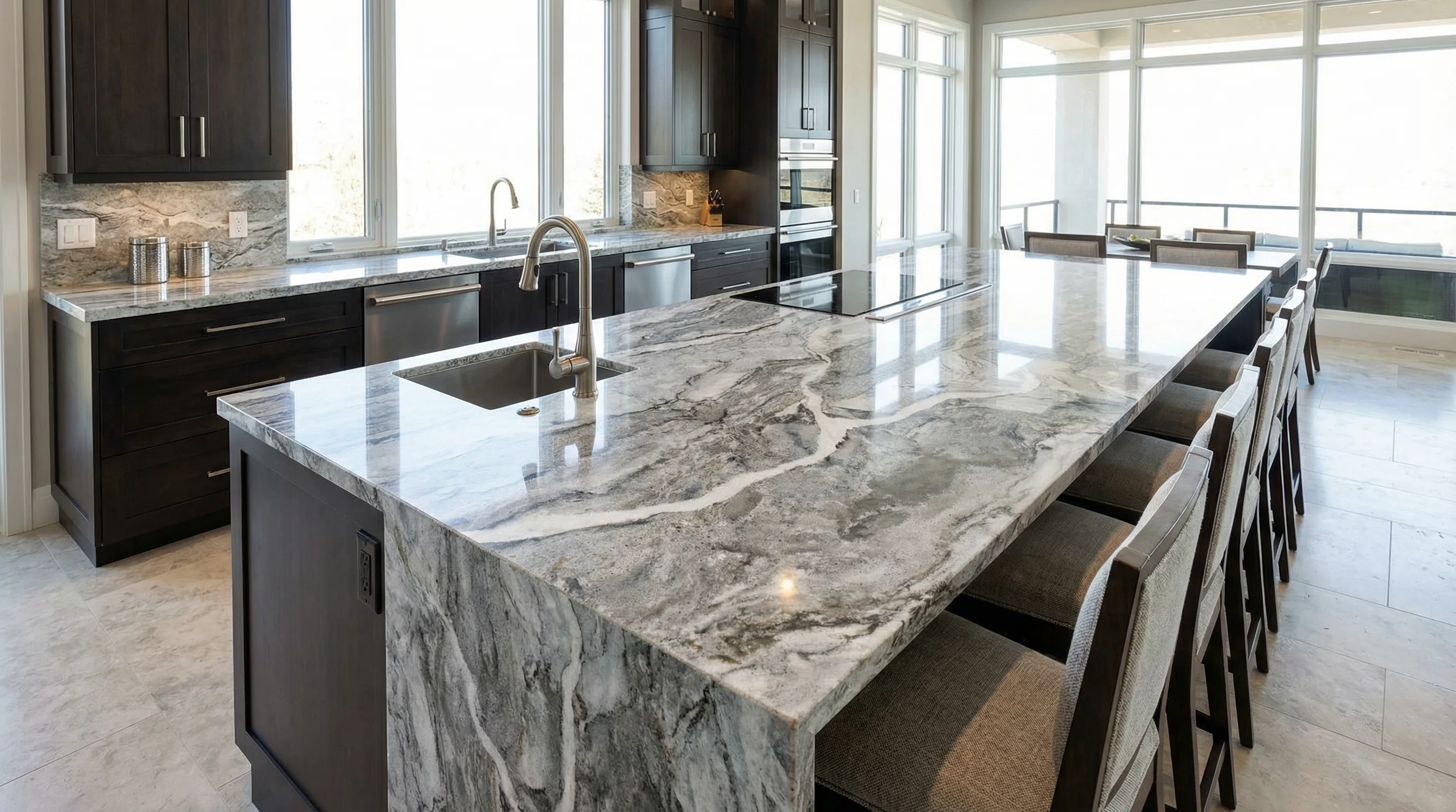 Глубокий серый оттенок, пронизанный экспрессивными молочными жилами, создает завораживающую иллюзию застывшего движения. Этот природный орнамент напоминает игру света на ночной водной глади, где каждая линия уникальна и неповторима. Подобная текстура придает пространству визуальную глубину и аристократизм, превращая функциональную поверхность в центральный арт-объект интерьера.
