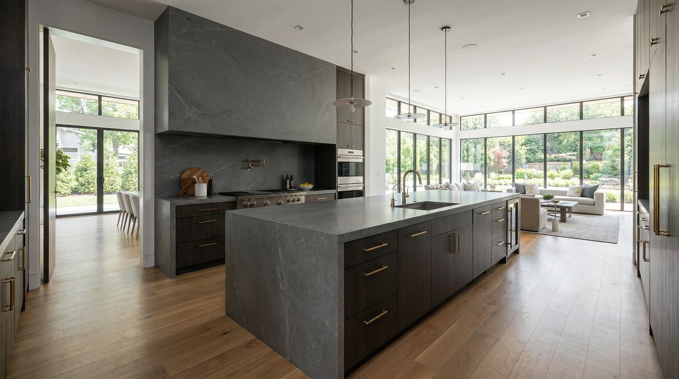 Этот материал воплощает в себе величие предгрозового неба, запечатленное в статике. Глубокий антрацитовый оттенок дополнен мягкими дымчатыми переходами, которые создают визуальный эффект объема и бесконечной глубины. Шелковистая фактура поверхности раскрывает всю сложность своего характера при разном освещении, плавно переходя от строгой матовой темноты к благородным серым нюансам.