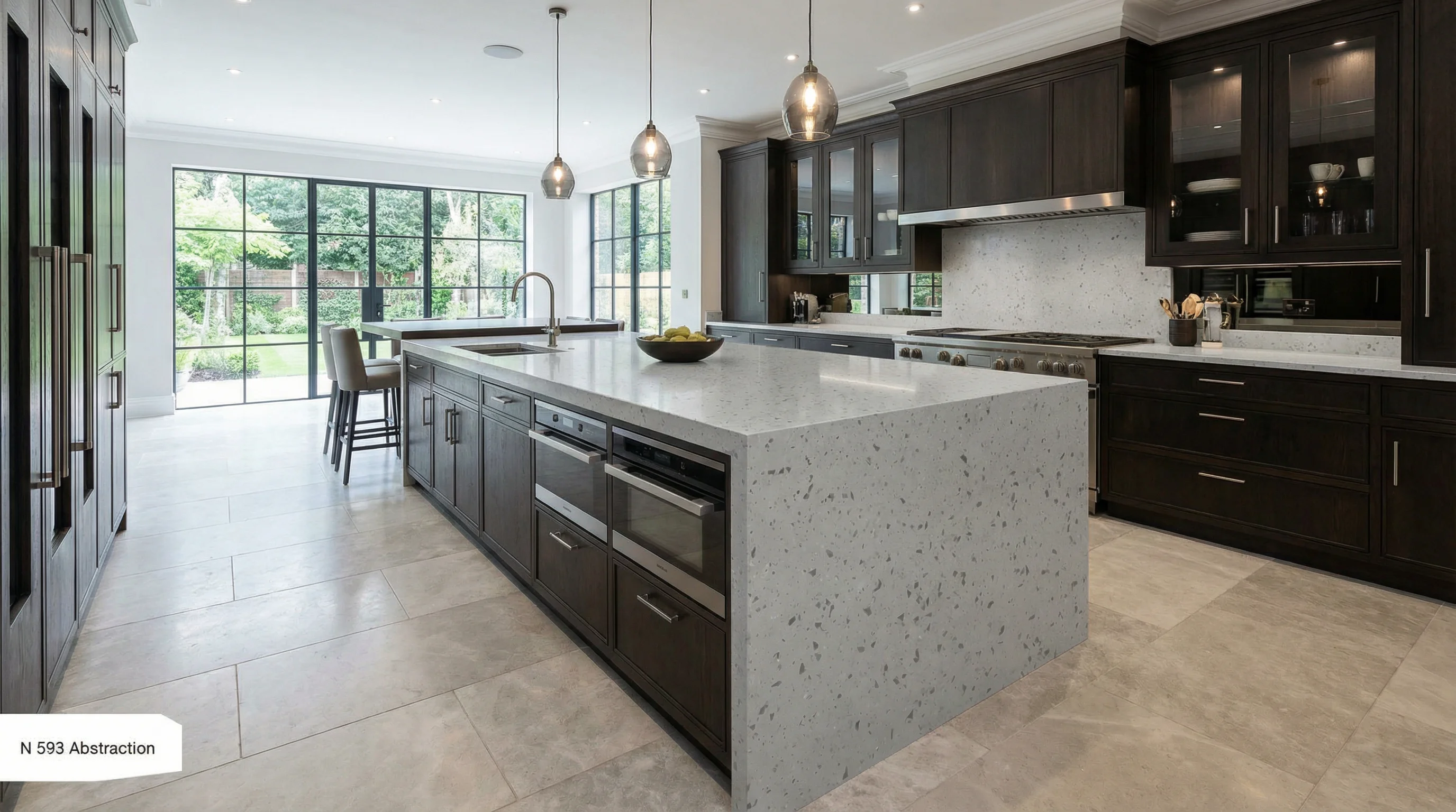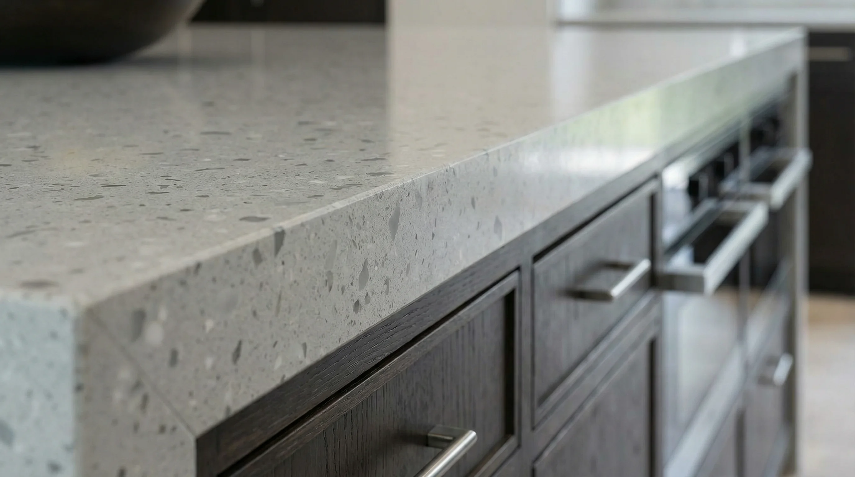 Эта поверхность притягивает взгляд своей сложной, многослойной фактурой. Мелкие вкрапления различных оттенков создают эффект живой глубины, напоминая россыпь кристаллов на светлом полотне. Каждая деталь рисунка выглядит как элемент абстрактной живописи, превращая рабочую зону в центр эстетического притяжения и подчеркивая высокий статус интерьера.