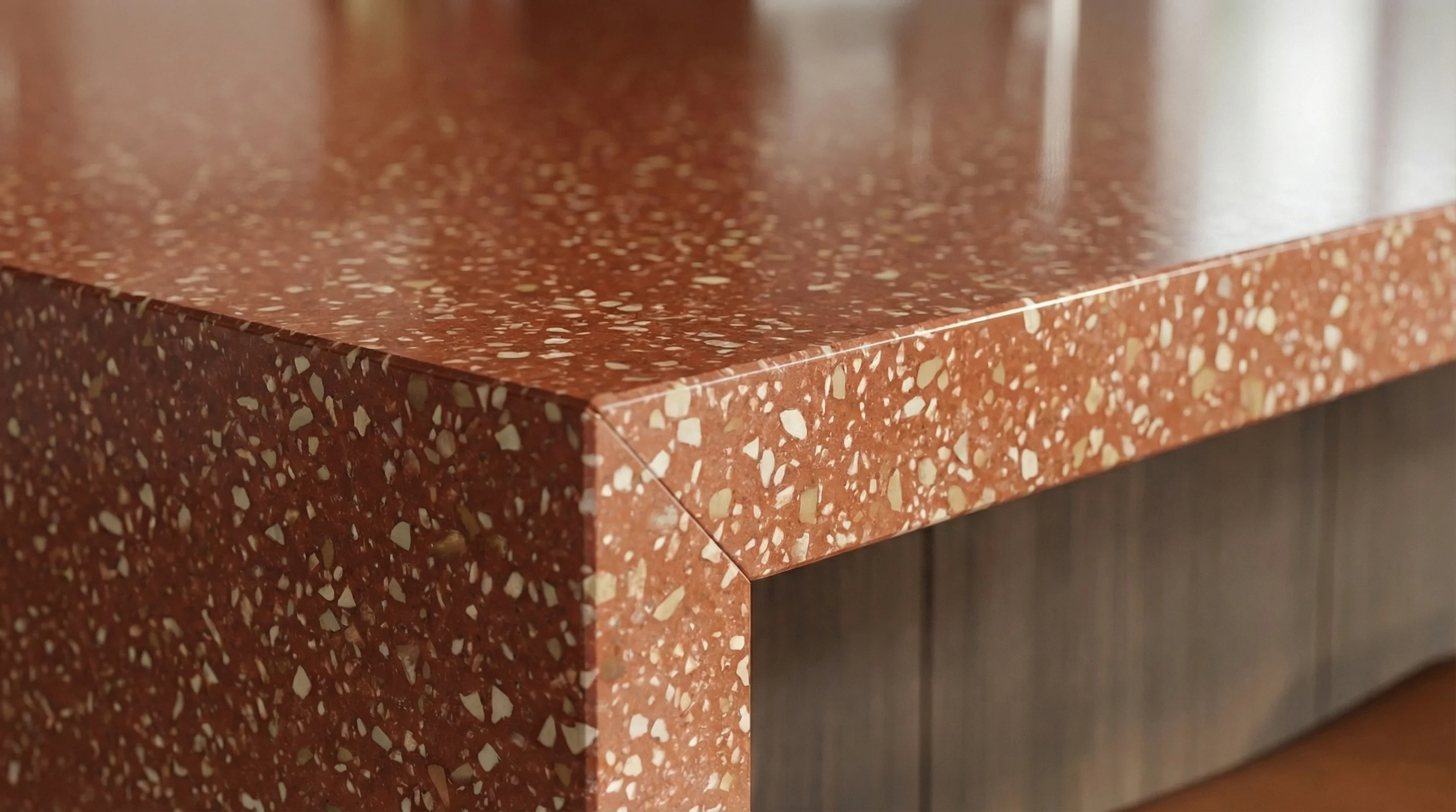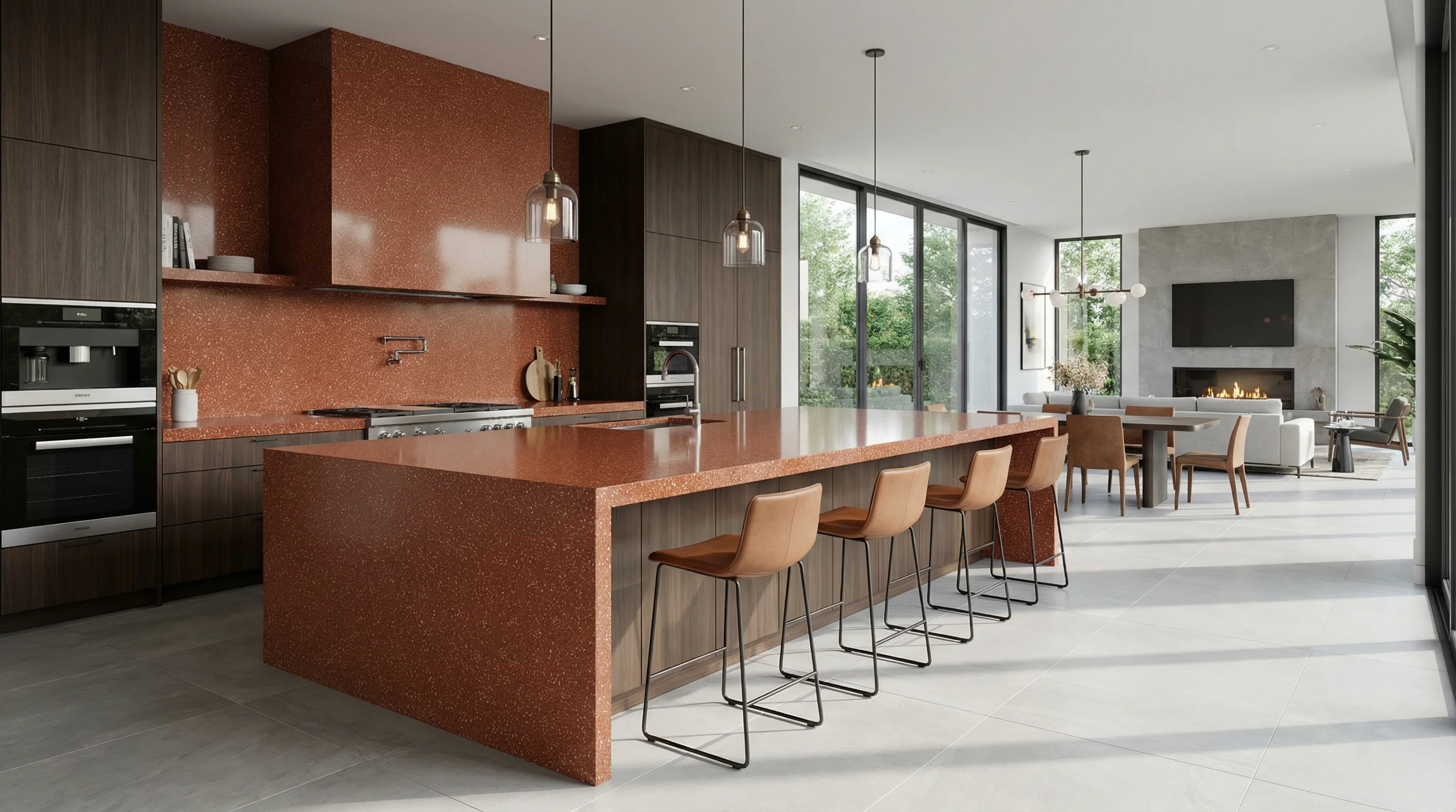 Этот материал воплощает собой эстетику благородного тепла и современного минимализма. Его глубокий, насыщенный оттенок, напоминающий обожженную глину и осенний закат, придает пространству особый характер и монументальность. Мелкозернистая фактура поверхности создает визуальную глубину, превращая каждое изделие в живой центр притяжения, который наполняет интерьер уютом и энергией.