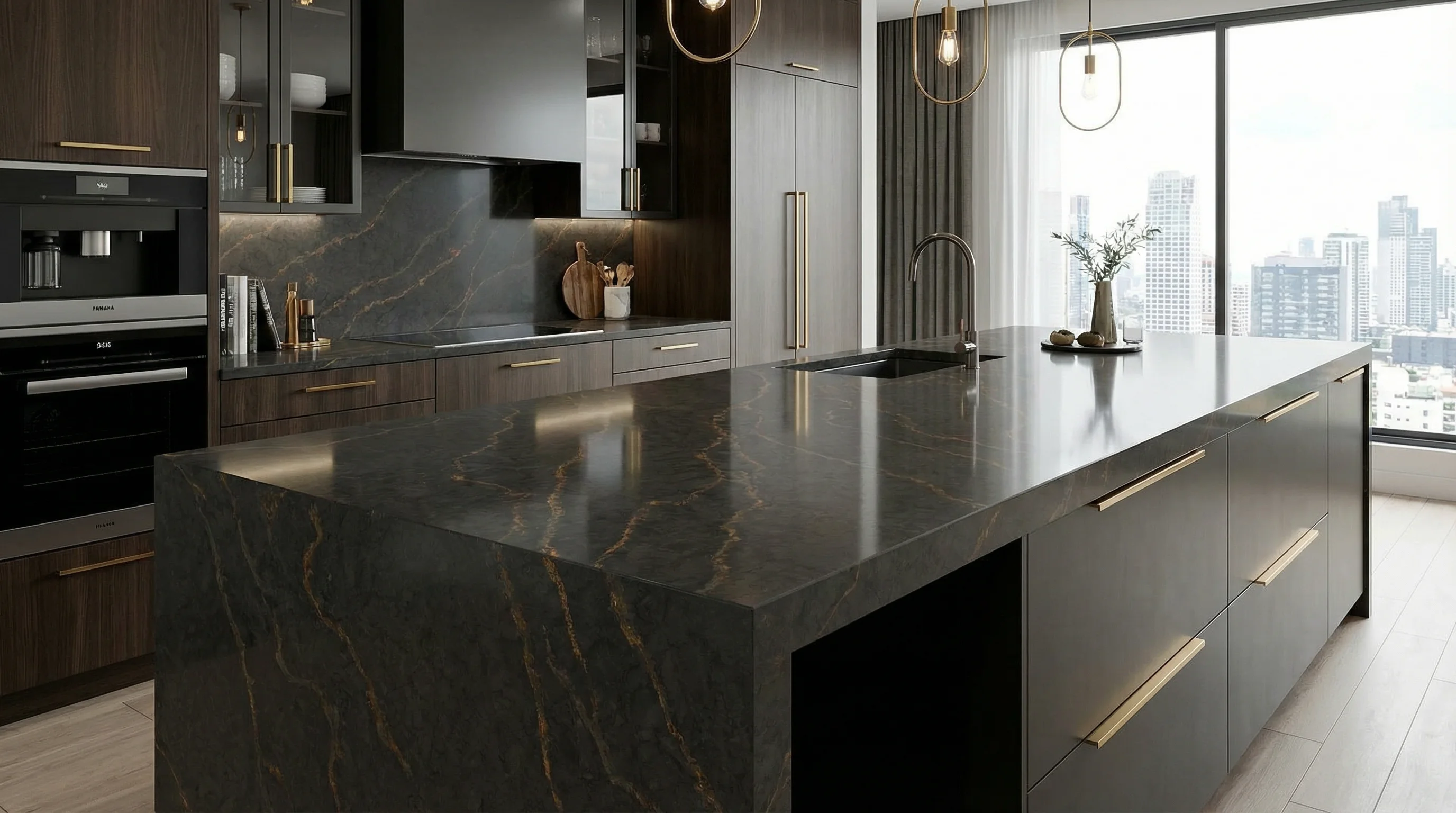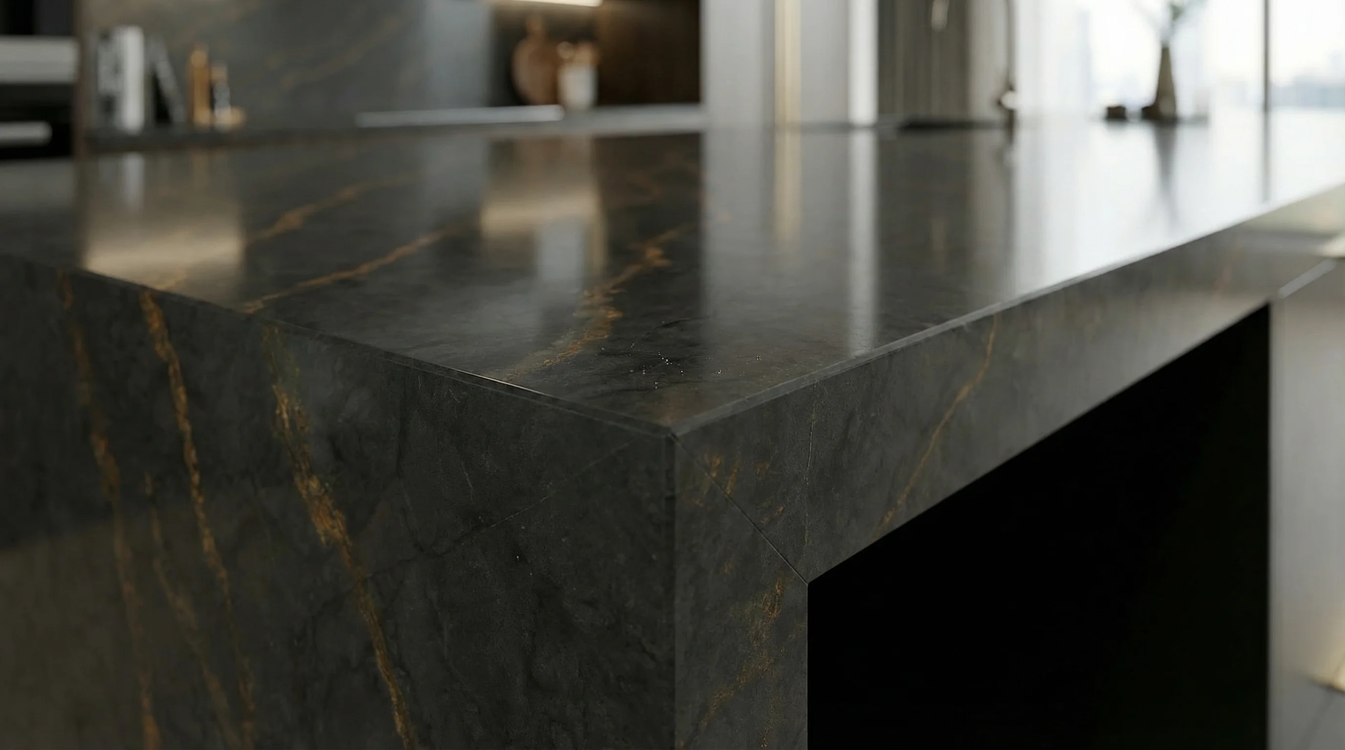Эта великолепная столешница, выполненная из искусственного камня Bohemian Flame, привносит в интерьер вашей кухни загадочность и неподдельную роскошь. Глубокий, темный фон, пронизанный динамичными золотисто-медными венами, напоминает о неукротимой стихии магмы, создавая впечатляющий визуальный эффект и атмосферу изысканного шика.