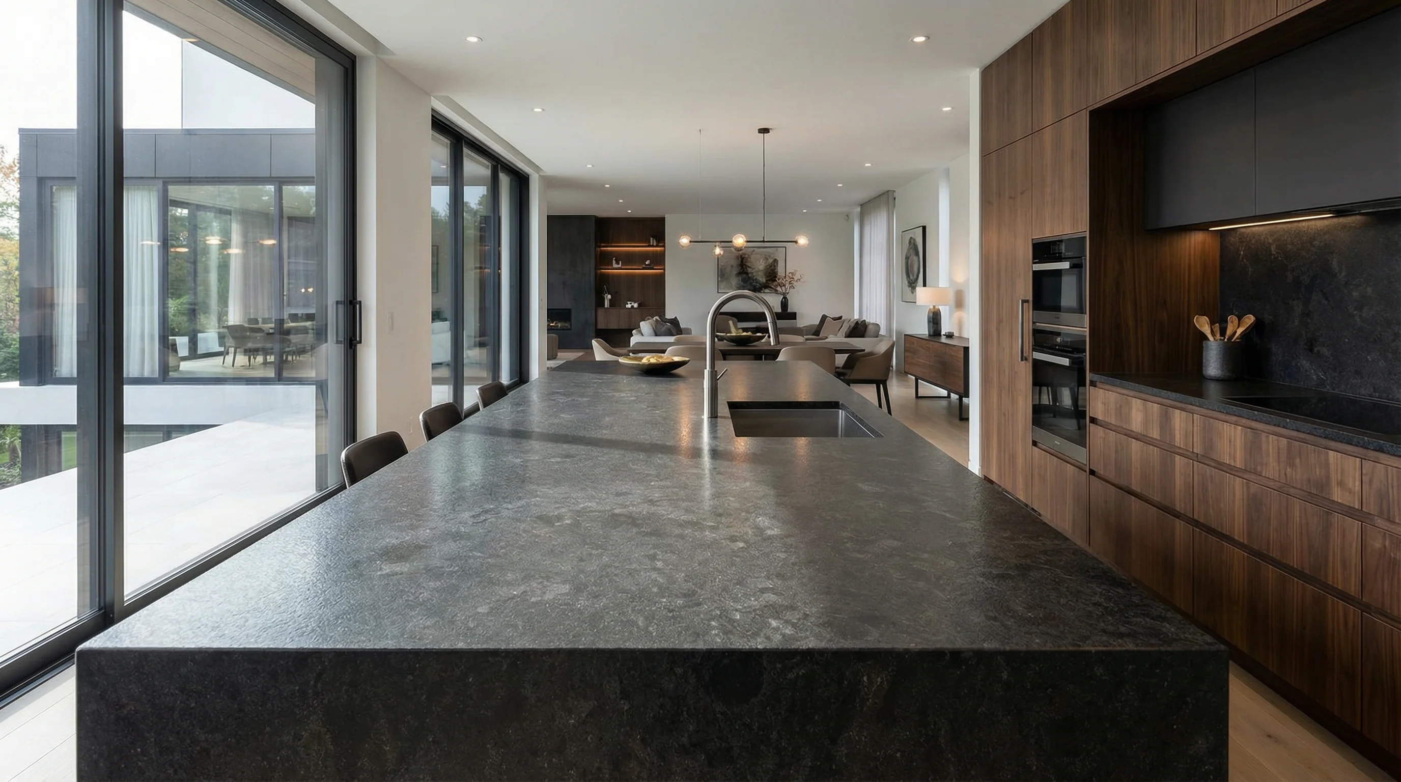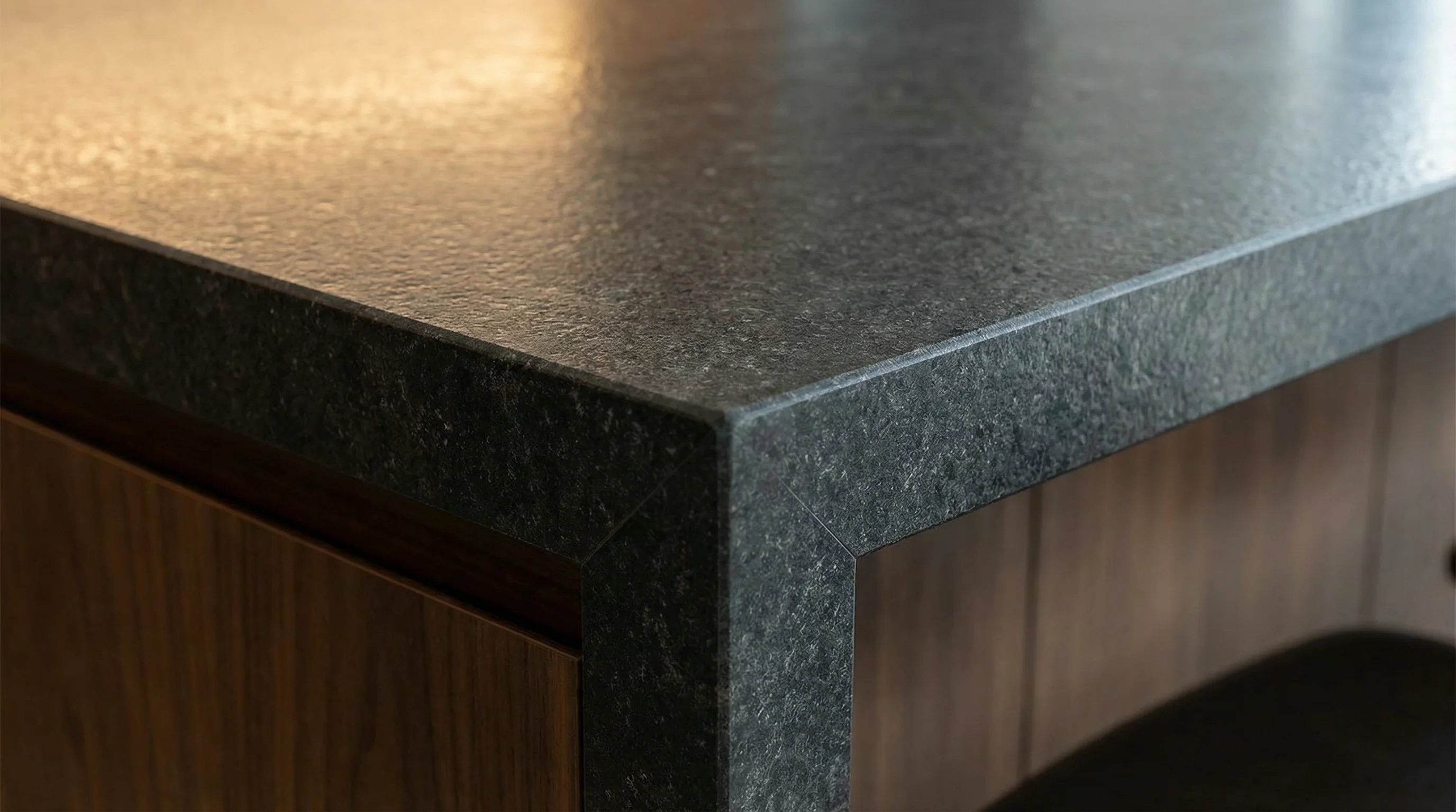 Эта великолепная столешница из камня Amadeus воплощает в себе глубокую, космическую эстетику. Насыщенный темный фон с уникальным узором из минеральных вкраплений и тончайших прожилок создает ощущение бездонной глубины и сдержанной роскоши. Каждый сантиметр поверхности уникален, превращая ваш кухонный остров в настоящее произведение искусства, которое становится центром притяжения в интерьере.