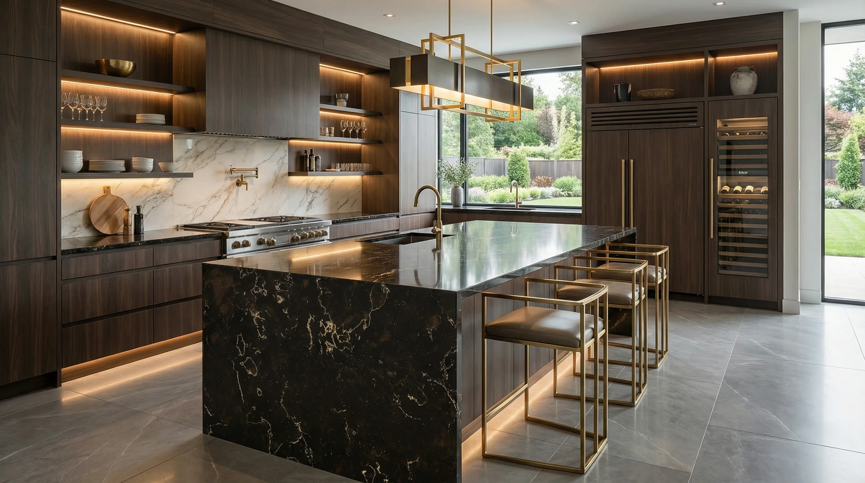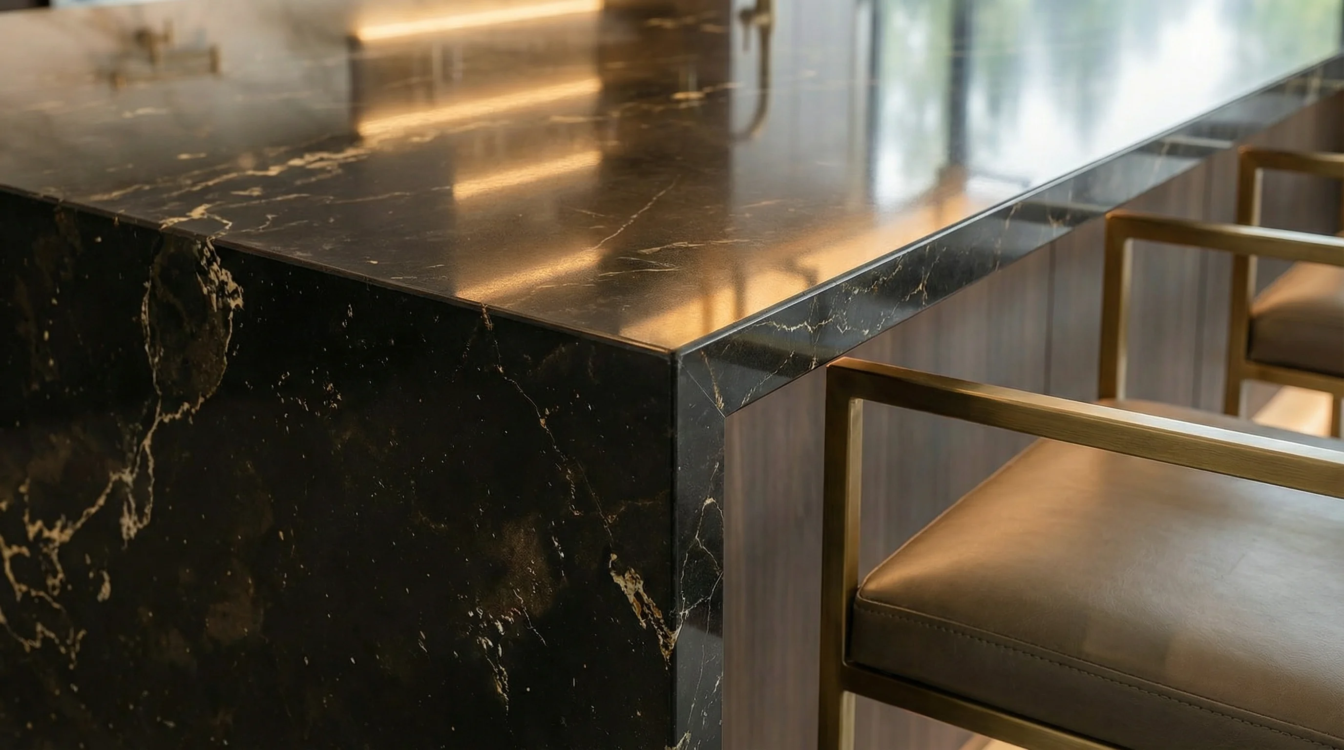 Выбор этого материала — это инвестиция в безупречный стиль и качество. Его темная, глубокая палитра с роскошными золотыми акцентами идеально впишется в современные и классические интерьеры, добавляя пространству ноту благородства и изысканности. Будь то кухонный остров или барная стойка, эта поверхность неминуемо притягивает внимание, создавая атмосферу уверенной роскоши и комфорта.