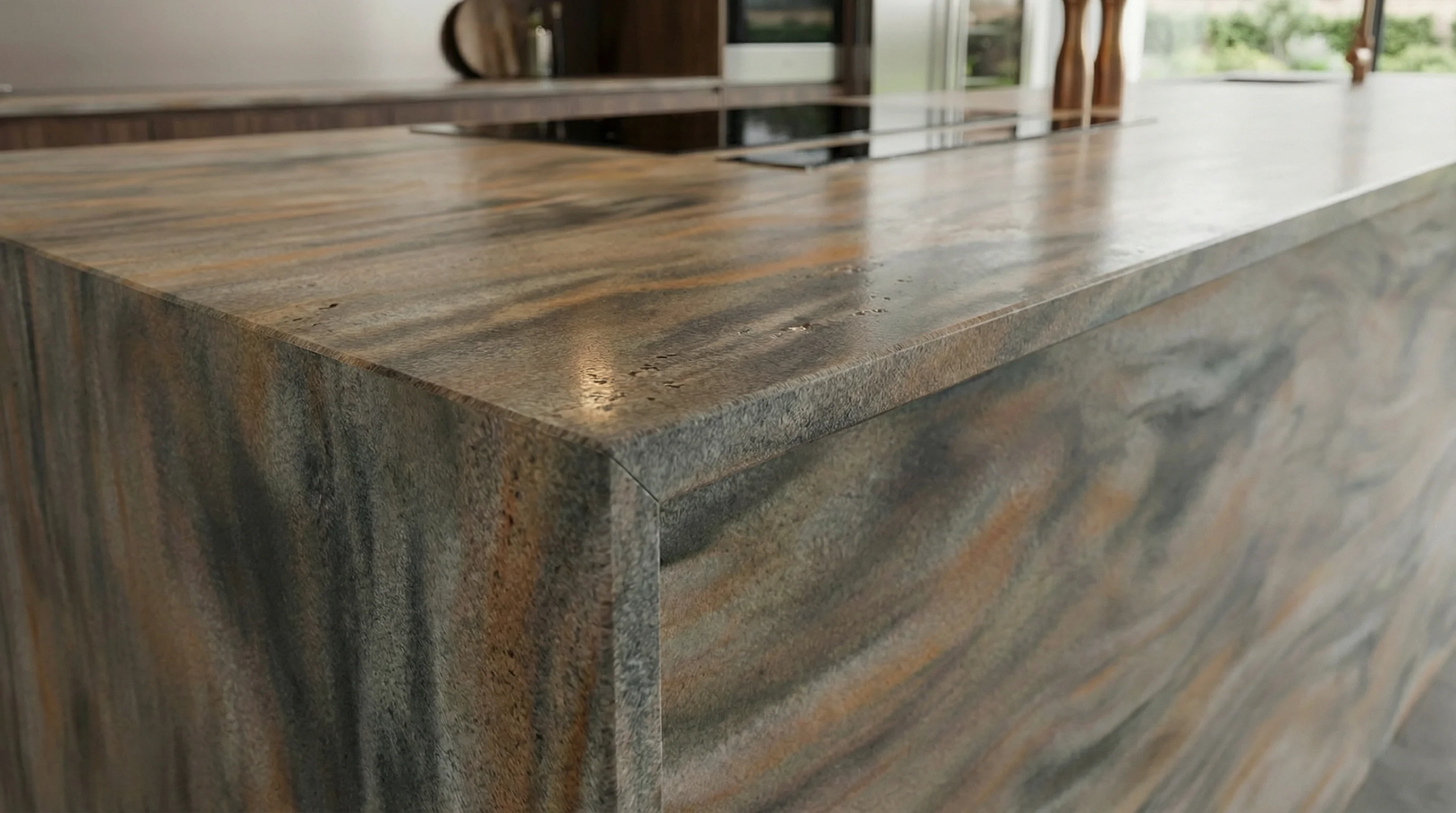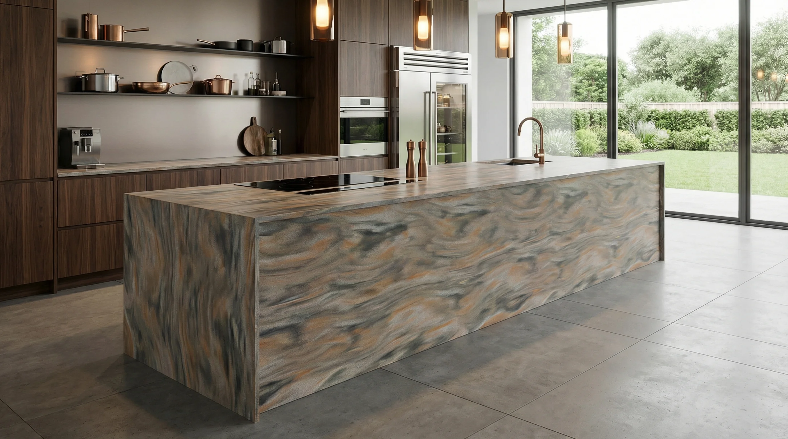 Это решение — воплощенный диалог между индустриальной эстетикой и природной энергией. В основе дизайна лежит сложная игра контрастов: глубокие тени антрацита встречаются с энергичными штрихами меди и мягкими переходами дымчатых оттенков. Магнетическая фактура имитирует естественные процессы окисления благородного металла, превращая поверхность в уникальное полотно, которое становится главным визуальным акцентом в современном пространстве.