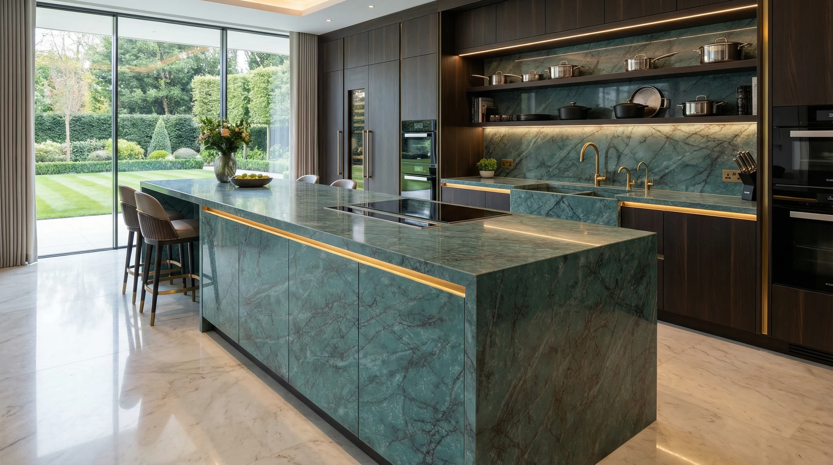Этот шедевр природной архитектуры воплощает в себе дух благородства и эстетику «тихой роскоши». Глубокий изумрудный фон, напоминающий сады в сумерках, пронизан сложной сетью золотисто-коричневых линий, создающих неповторимый графичный узор. Каждое изделие обладает собственным характером, превращая интерьер в пространство с глубокой историей и утонченным визуальным ритмом.