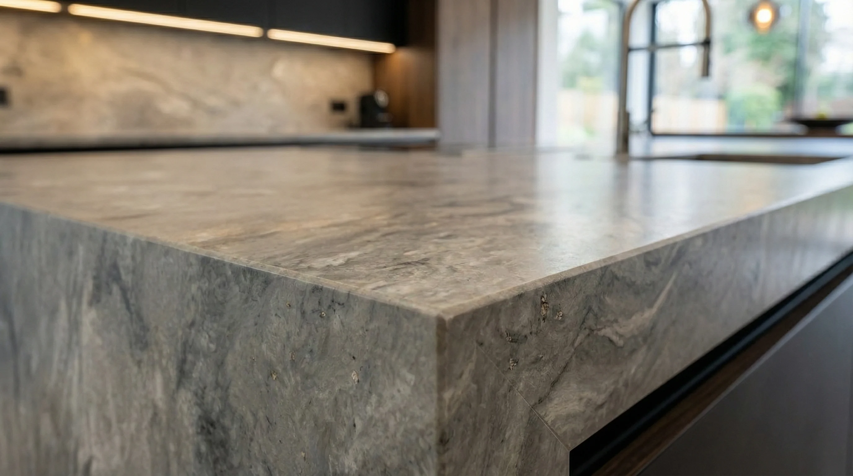 Это воплощение современной элегантности, где спокойная палитра серых оттенков встречается с мощью и первозданной красотой природных текстур. Мягкая игра цветовых переходов создает глубокую, «живую» поверхность, напоминающую предрассветную дымку над застывшими скалами. Каждое вкрапление и нюанс рисунка подчеркивают многослойность материала, превращая его в центральный арт-объект вашего пространства.