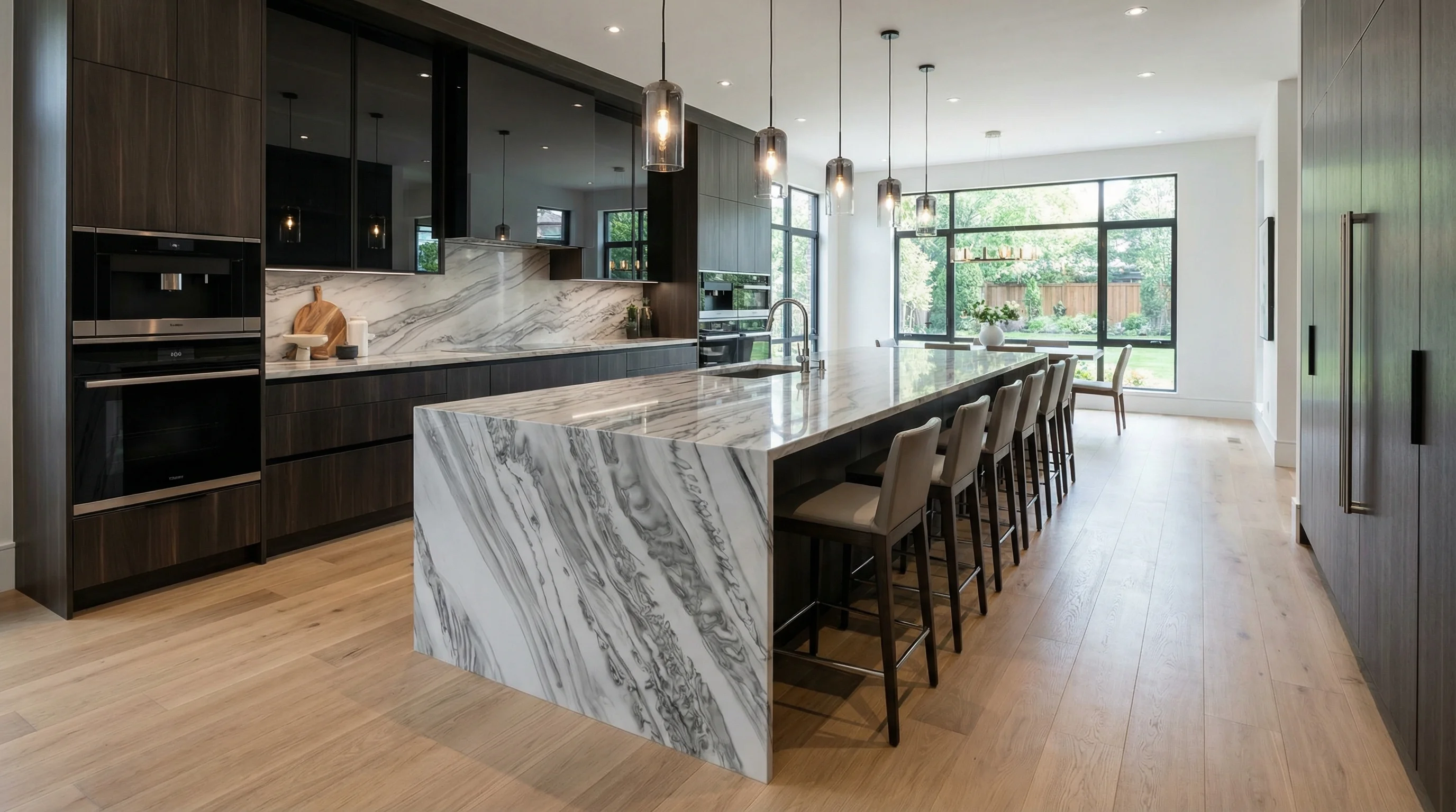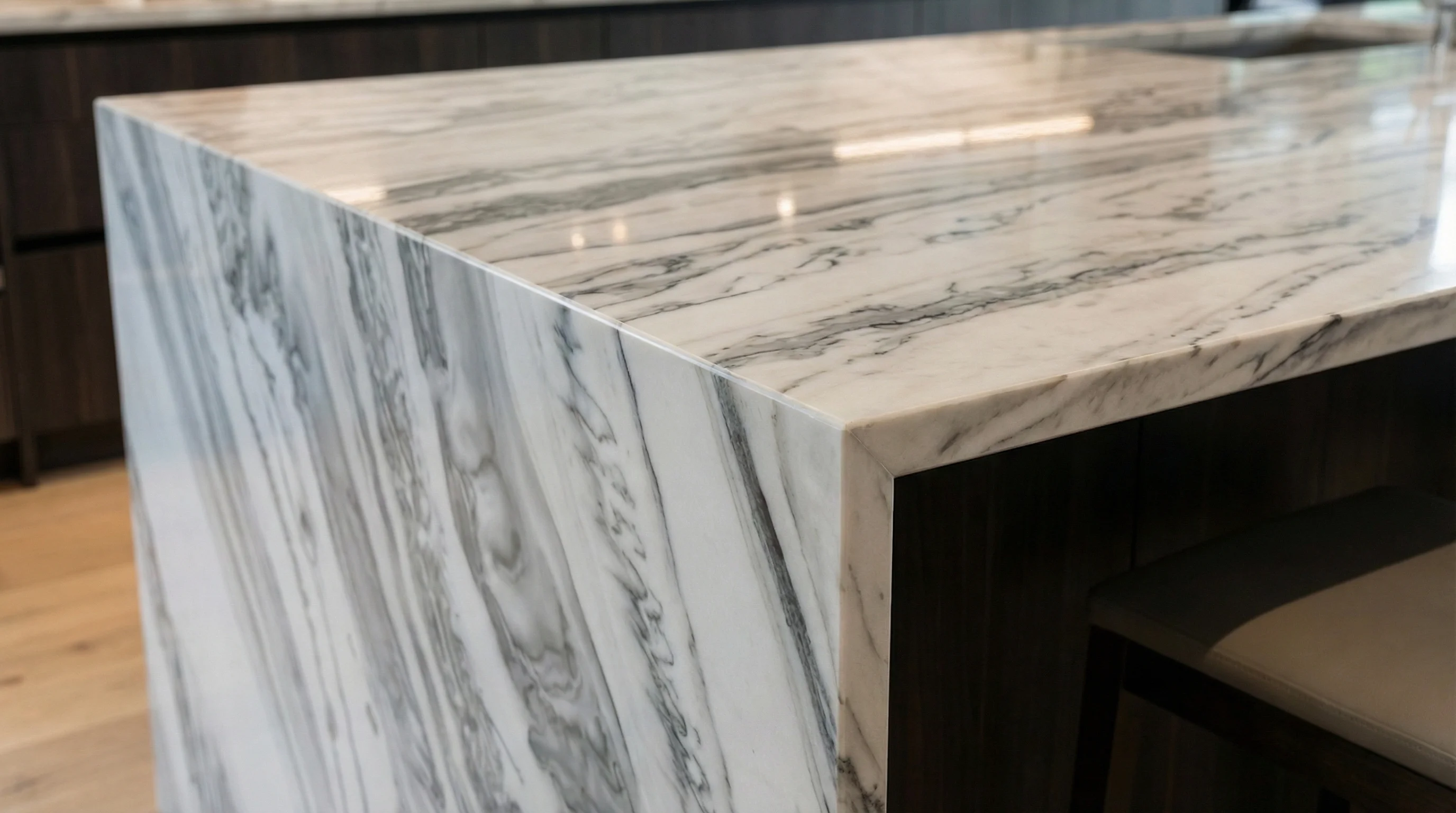 Сдержанная цветовая палитра и эффектный контраст позволяют материалу органично дополнять интерьеры в стиле минимализма или лофта. Изделие безупречно сочетается с темными древесными фасадами и лаконичной металлической фурнитурой, подчеркивая высокий статус и утонченный вкус владельца. Оно превращает функциональную зону в пространство для вдохновения и истинного комфорта.