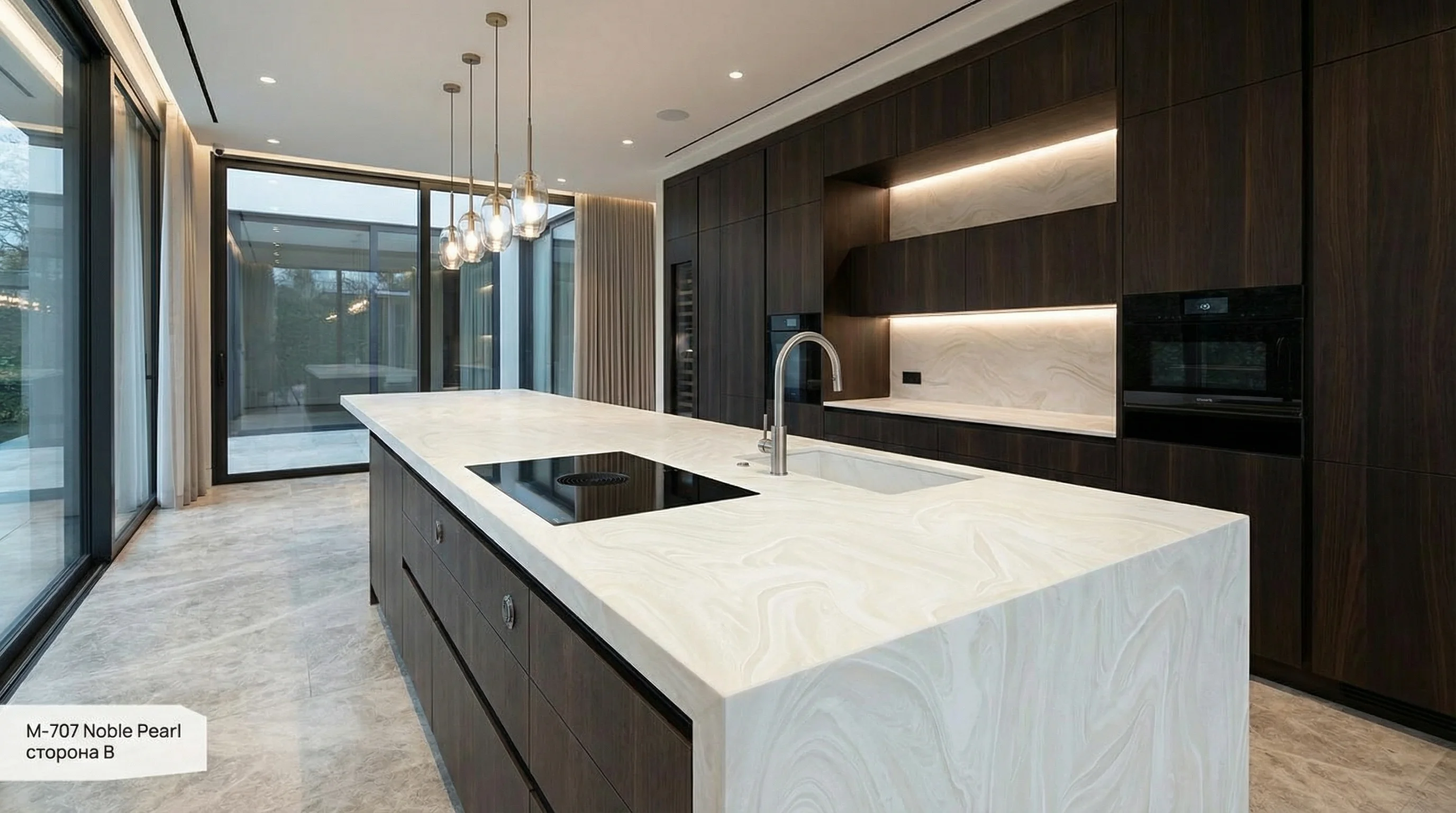 Это воплощение утонченности и спокойного величия. Поверхность завораживает мягкими переливами и сложным рисунком, напоминающим игру света в глубинах драгоценного жемчуга. Тонкие, почти неуловимые переходы молочных и кремовых оттенков создают эффект живой материи, которая гармонично дополняет современные минималистичные пространства и благородные темные фасады мебели.