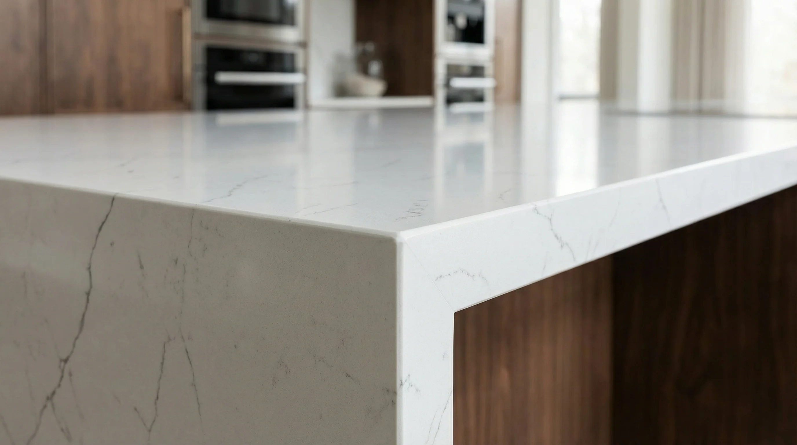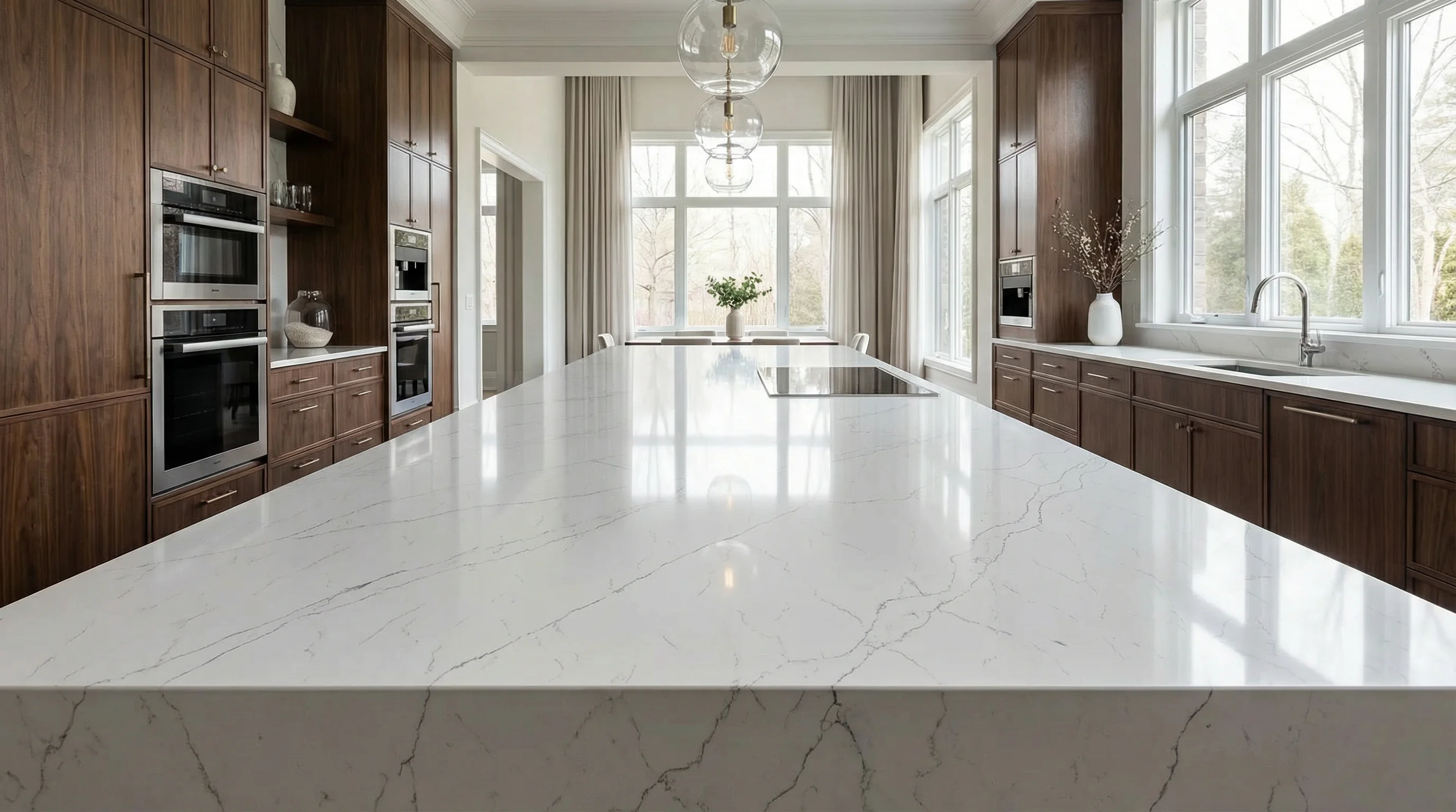 Эта поверхность воплощает в себе чистоту и абсолютное благородство, преображая интерьер своим мягким, деликатным сиянием. Молочно-белое полотно с тонкими, почти прозрачными прожилками напоминает структуру утреннего тумана или застывшее облако. Текстура материала обладает удивительной глубиной: кажется, что свет проникает внутрь изделия, создавая эффект объема и наполняя помещение ощущением воздушности и визуальной свободы.
