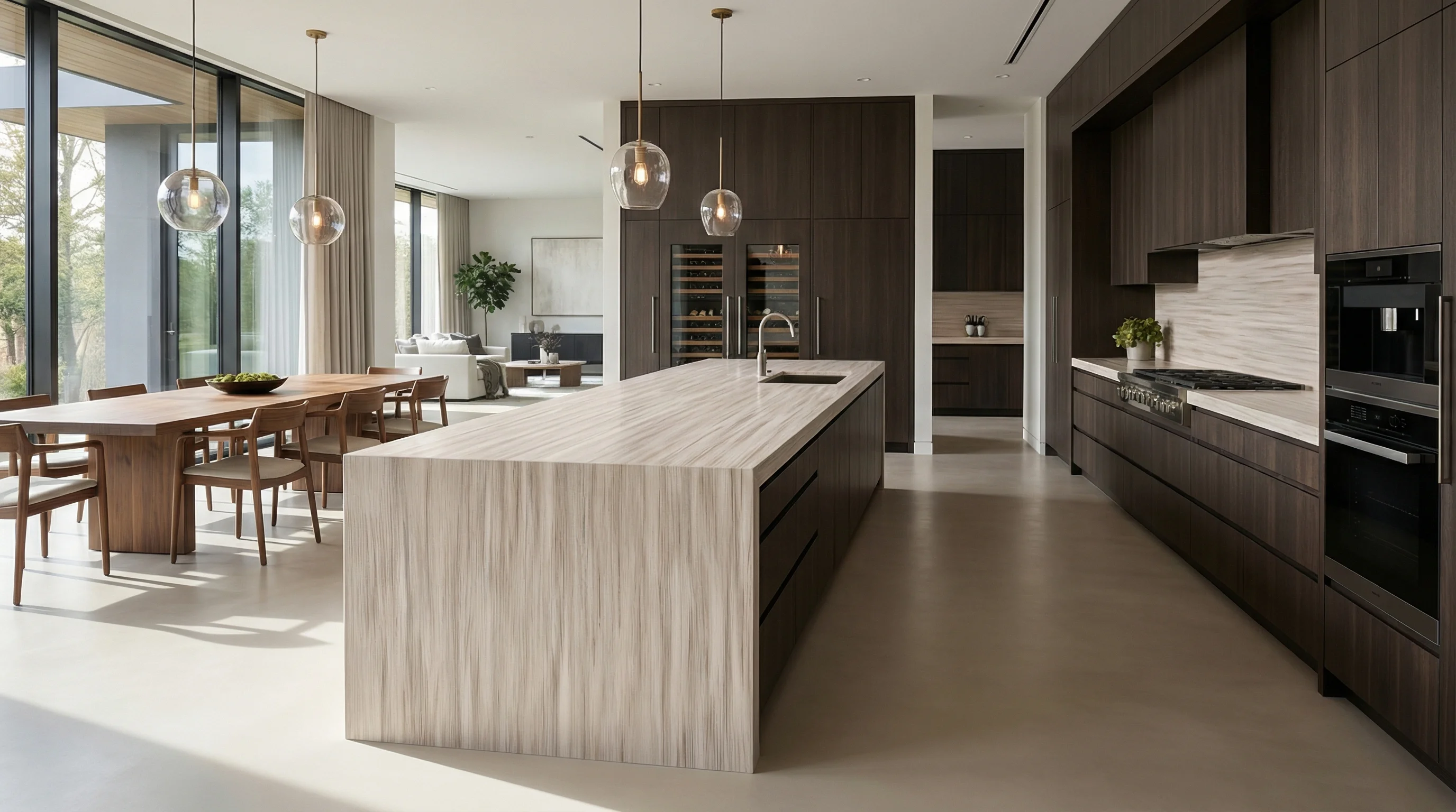 Этот архитектурный элемент привносит в пространство эстетику упорядоченного природного хаоса. Тонкие, параллельные линии в теплых бежевых тонах создают эффект мягкого движения, напоминающий бесконечные рельефы пустыни, созданные ветром. Благодаря своей уникальной текстуре, поверхность гармонично сочетает визуальный уют древесных оттенков с безупречной монументальностью, наполняя интерьер ощущением спокойствия и чистого света.