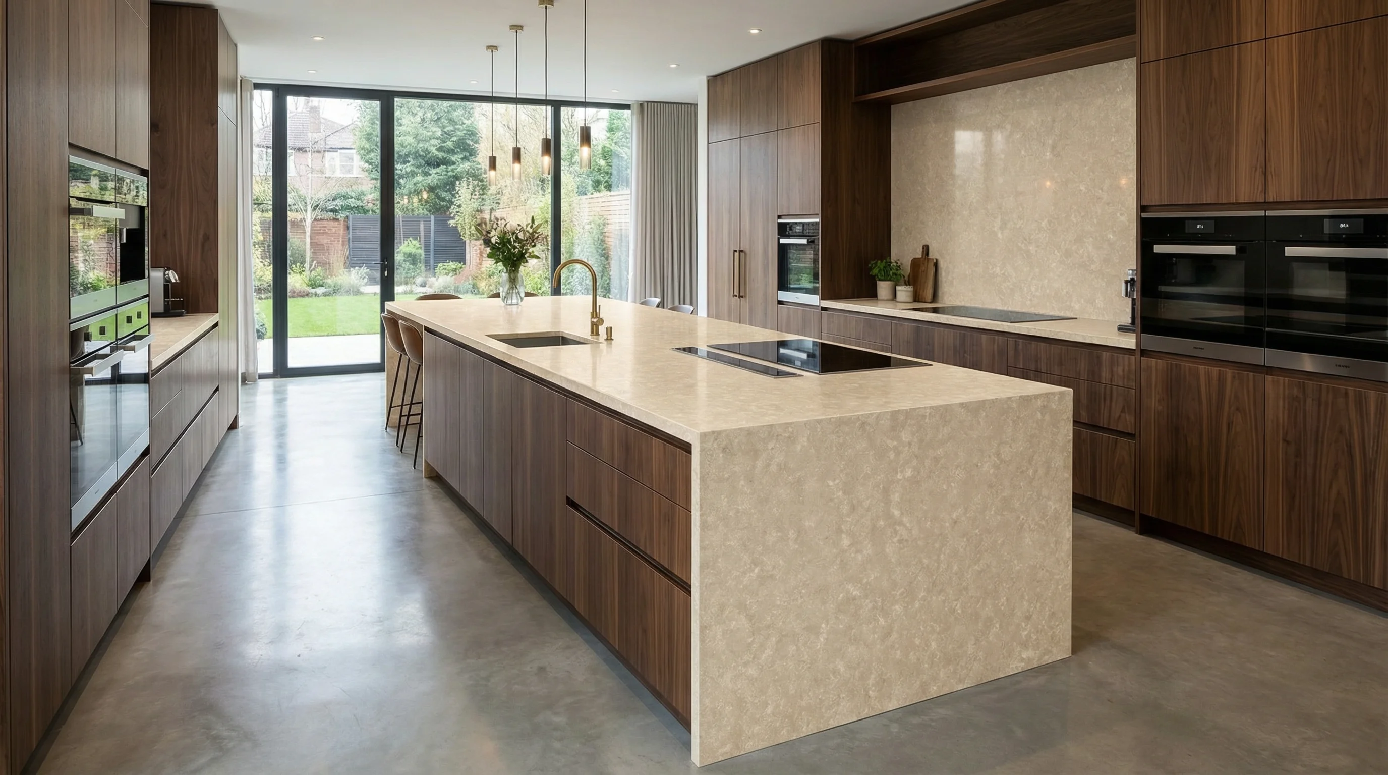 Поверхность завораживает своей мягкой, обволакивающей палитрой, в которой гармонично переплетаются оттенки топленого молока и золотистого песка. Уникальный рисунок с эффектом легкой дымки придает интерьеру визуальную глубину, превращая рабочую зону в центральный элемент пространства. Такое исполнение безупречно сочетается с благородными древесными фактурами, создавая атмосферу спокойной роскоши и наполняя дом мягким, естественным светом.