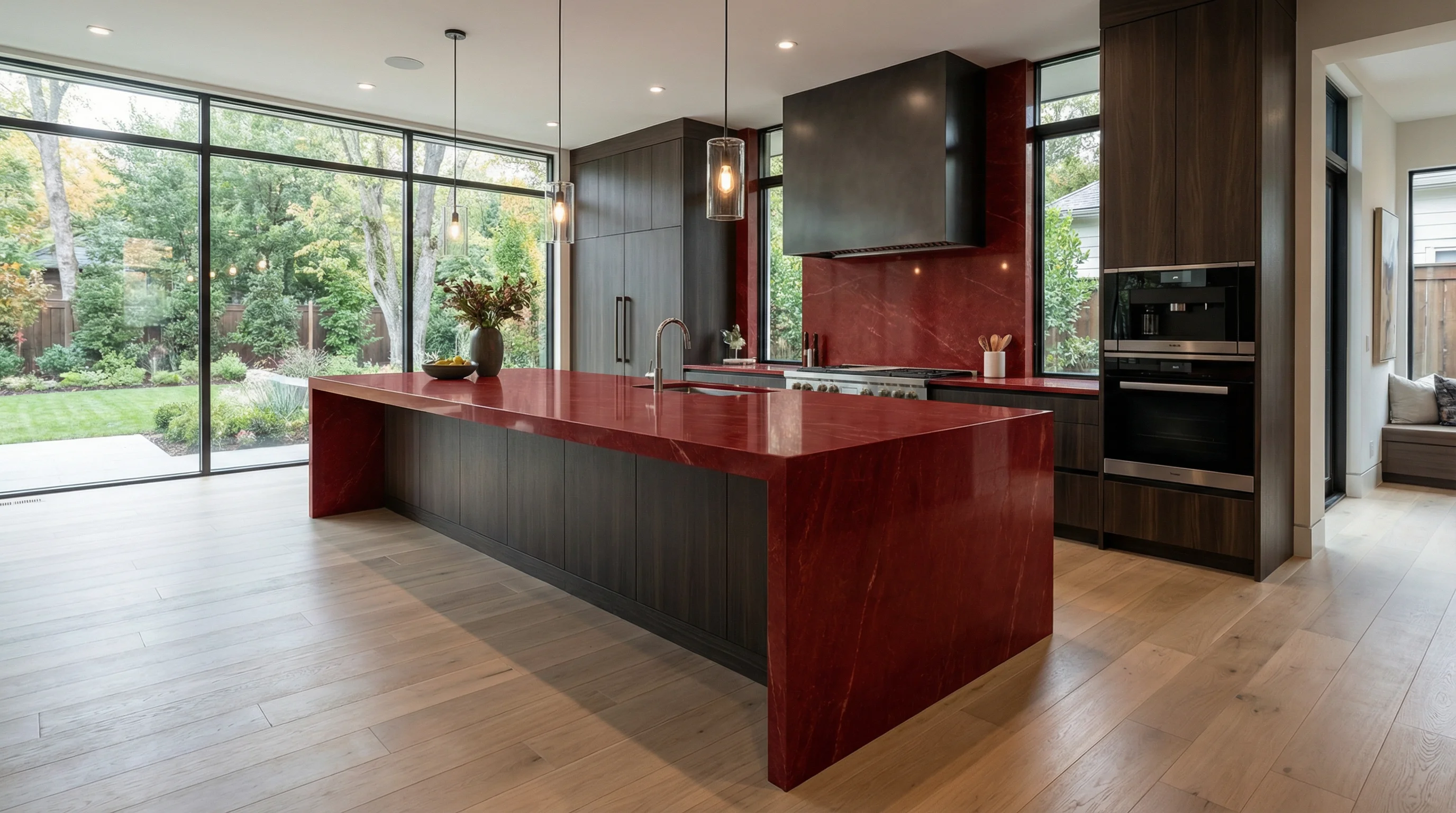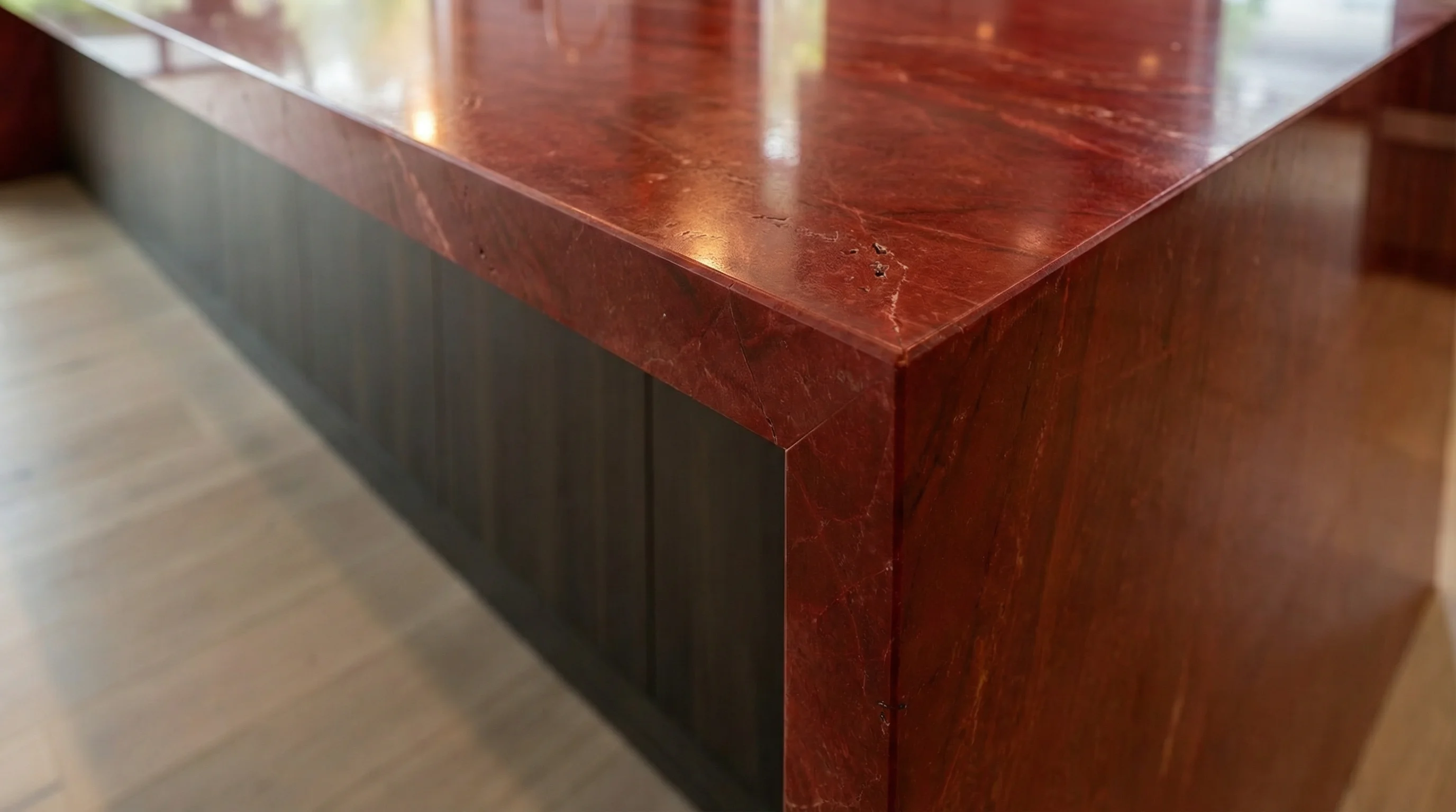 Эта поверхность притягивает взгляд своим глубоким, насыщенным винным оттенком, который словно аккумулирует энергию внутри себя. Тонкие, едва уловимые прожилки пронизывают полотно, создавая уникальный живой рисунок, напоминающий застывшую стихию. Безупречная полировка подчеркивает глубину цвета, превращая каждый сантиметр пространства в художественное высказывание, полное благородства и внутренней силы.