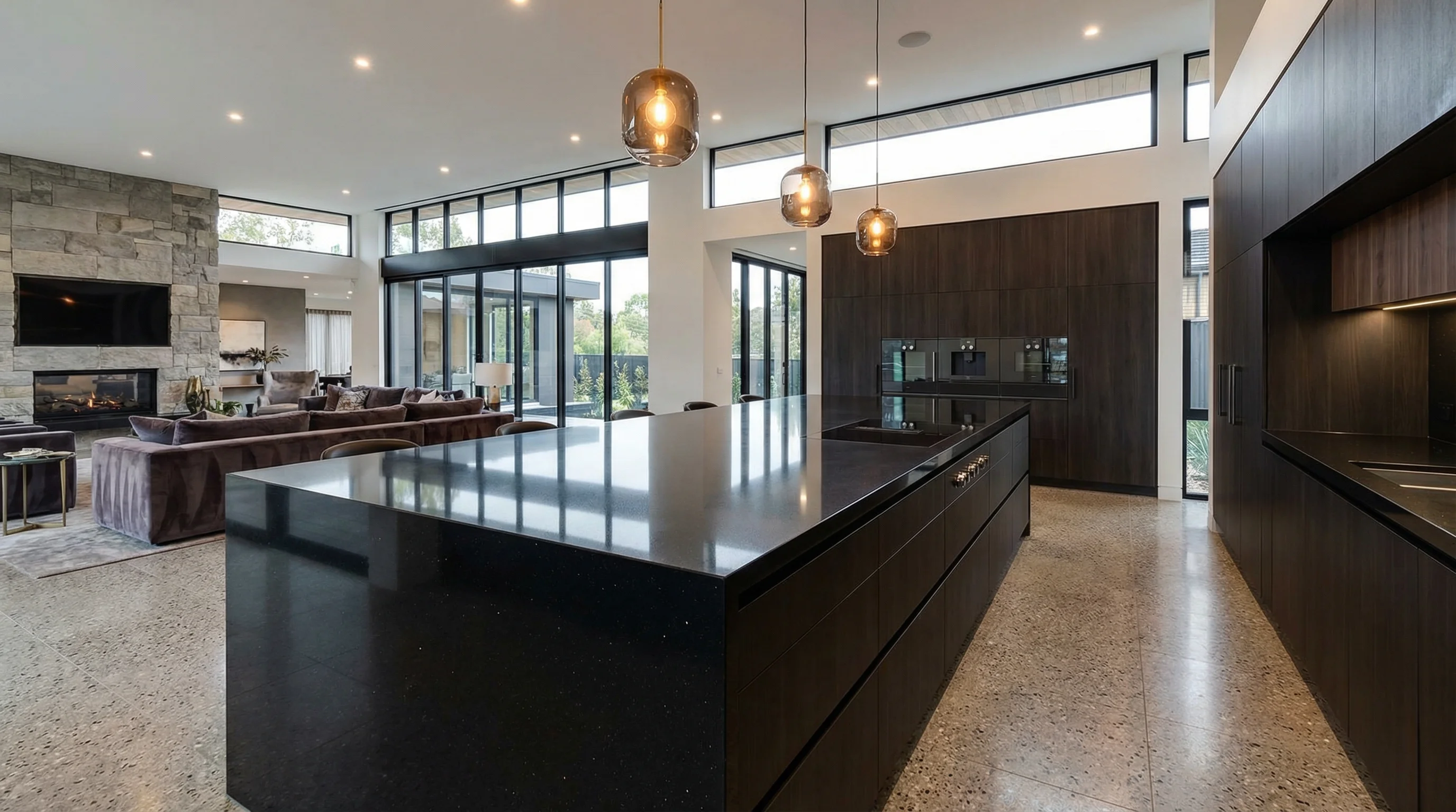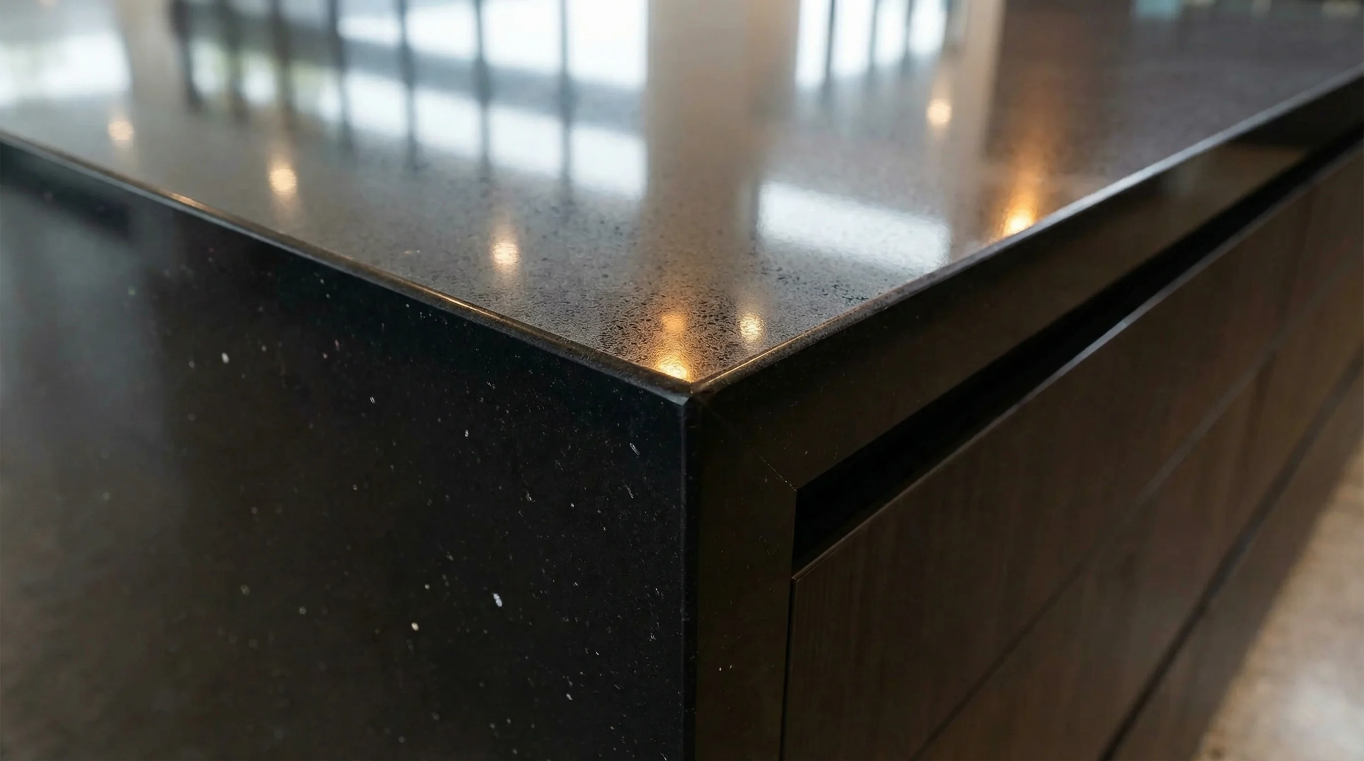 Поверхность завораживает своей безупречной глубиной и тонкой игрой света. В насыщенном темном полотне оживают мерцающие вкрапления, напоминающие мириады звезд в ночном небе. Эта эстетика превращает любую функциональную зону в центральный элемент интерьера, подчеркивая статус и безупречный вкус владельца через благородную лаконичность черного цвета.