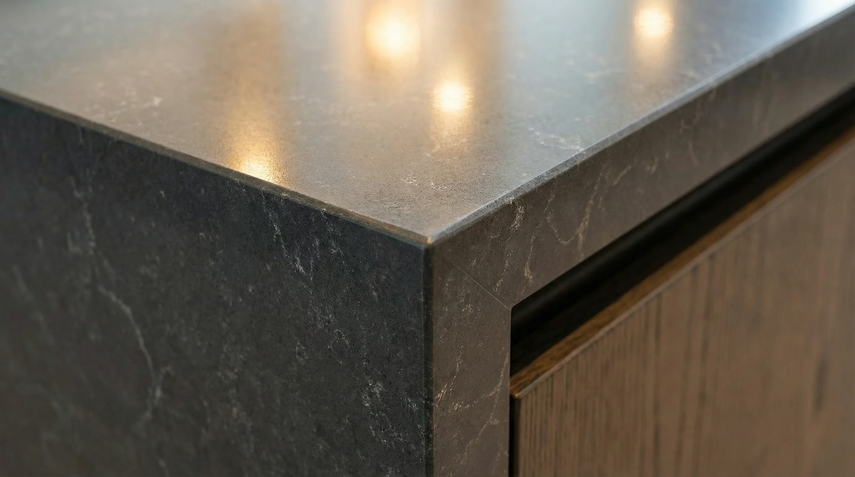 Поверхность завораживает глубоким угольным оттенком, по которому тонкой паутиной распределены изящные светлые прожилки. Визуально текстура напоминает природные узоры, рожденные в самом сердце стихии, где каждый штрих подчеркивает уникальность изделия. Благородный мягкий отблеск придает материалу визуальную глубину, при этом сохраняя строгость и лаконичность современного премиального дизайна.