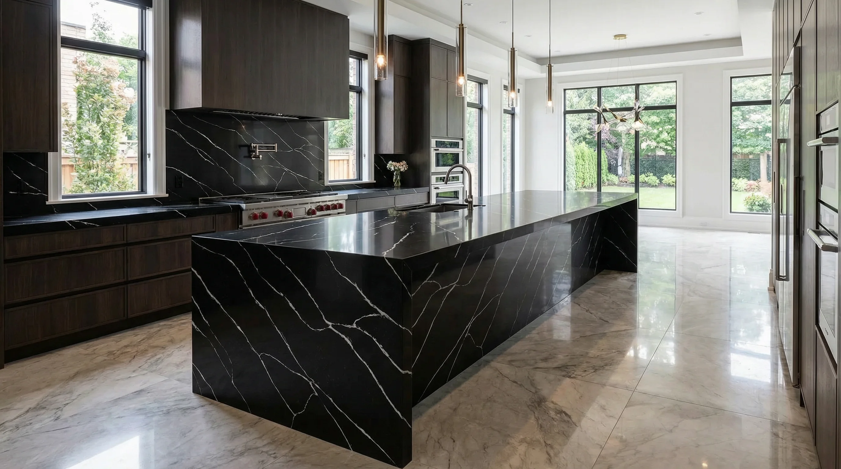 Глубокий антрацитовый цвет и хаотично переплетенные белые нити создают уникальный природный рисунок, напоминающий ночное небо в час грозы. Эта поверхность притягивает взгляд своей драматичностью и безупречной глубиной цвета, становясь безусловным смысловым центром интерьера. Каждое изделие обладает своим неповторимым характером: динамичные линии прожилок эффектно контрастируют с темным фоном, создавая ощущение бесконечного движения и жизни внутри монументальной формы.