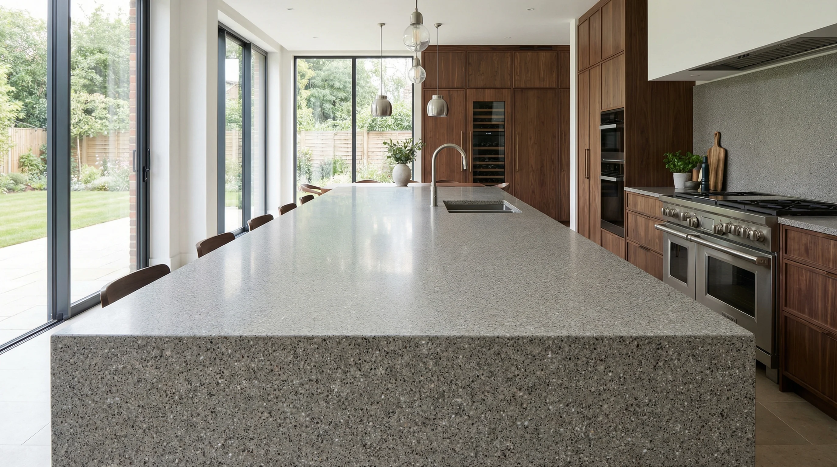 Это изделие воплощает в себе эстетику спокойного туманного утра, когда мир замирает в предчувствии нового дня. Текстура Terrazzo Mist представляет собой искусную игру множества мелких вкраплений, которые создают невероятную визуальную глубину. Мягкие переходы серых оттенков и едва уловимый блеск частиц превращают рабочую зону в монументальный арт-объект, гармонично дополняющий современные интерьеры с элементами дерева и металла.
