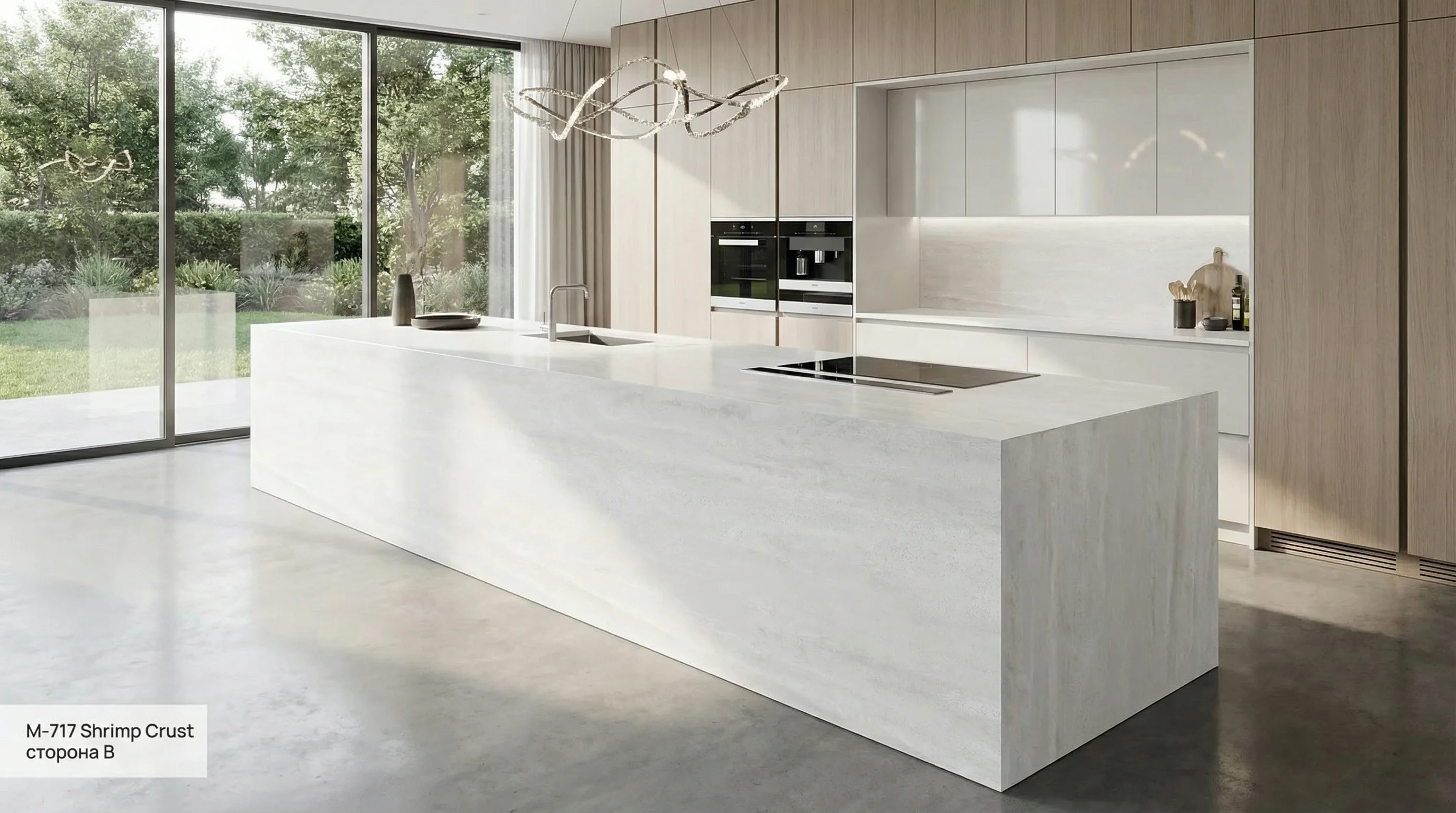 Тончайшая игра полутонов и едва заметные вкрапления воссоздают эстетику органических структур, веками скрытых в глубинах океана. Деликатная, светлая палитра с мягким минеральным рисунком создает эффект живой, дышащей поверхности, которая плавно меняет свой облик в зависимости от угла падения солнечного света, наполняя пространство чистотой и легкостью.