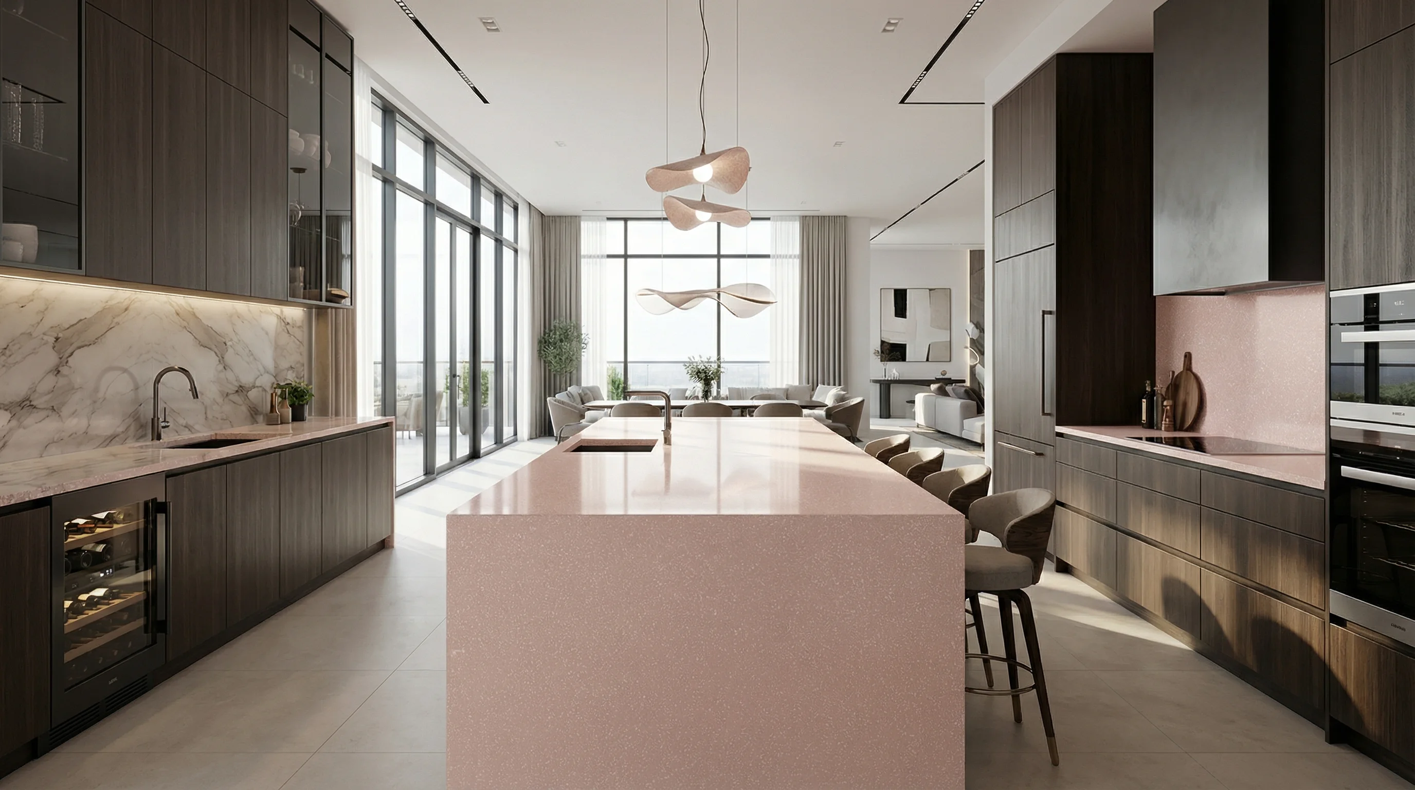 Это воплощение деликатной роскоши в современном интерьере. Глубокий, мягкий оттенок с едва уловимыми мелкозернистыми вкраплениями создает ощущение бескрайних просторов и теплого закатного света. Поверхность притягивает взгляд своей лаконичностью, становясь гармоничным визуальным центром пространства, где строгая эстетика встречается с мягким уютом.