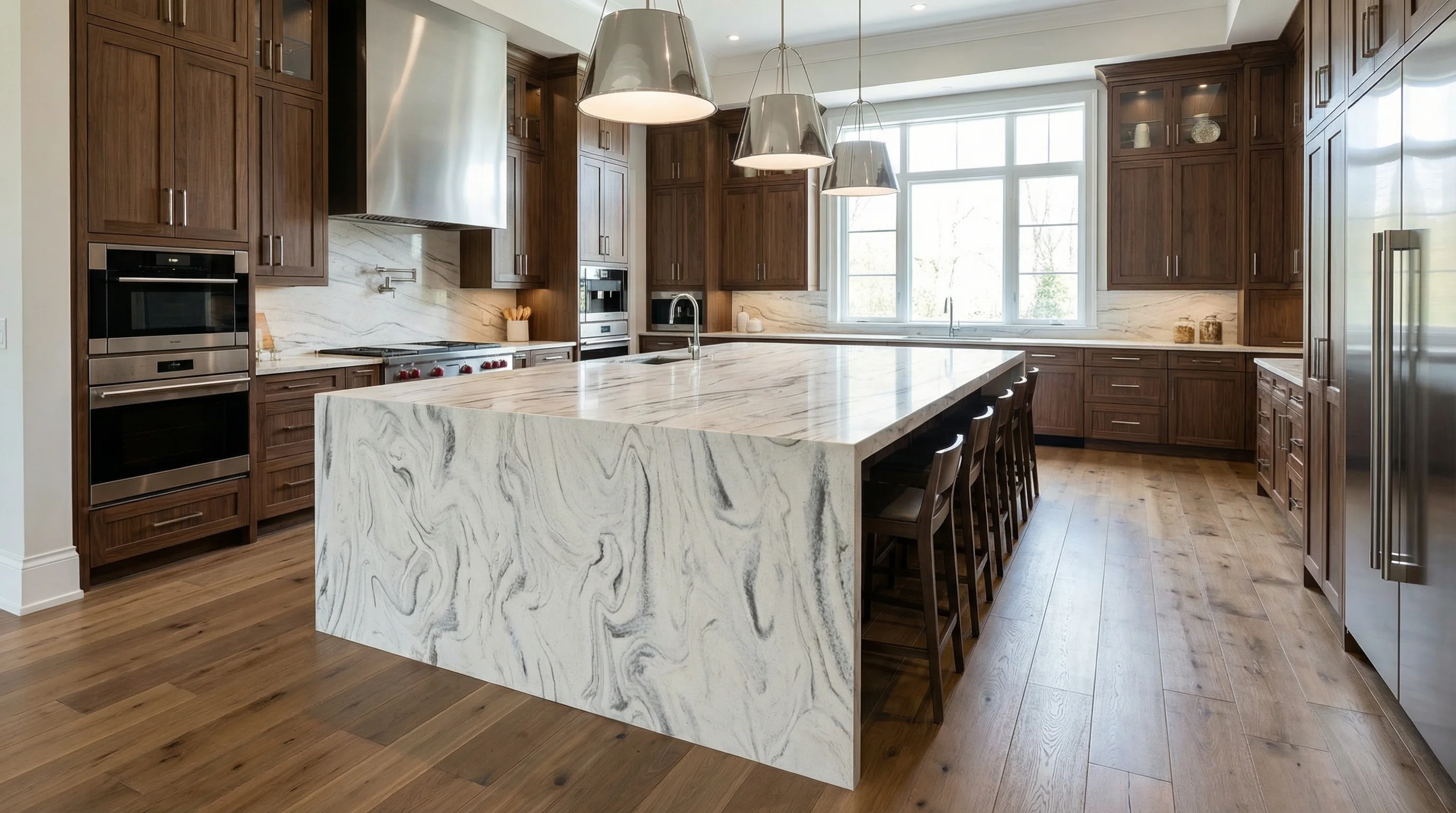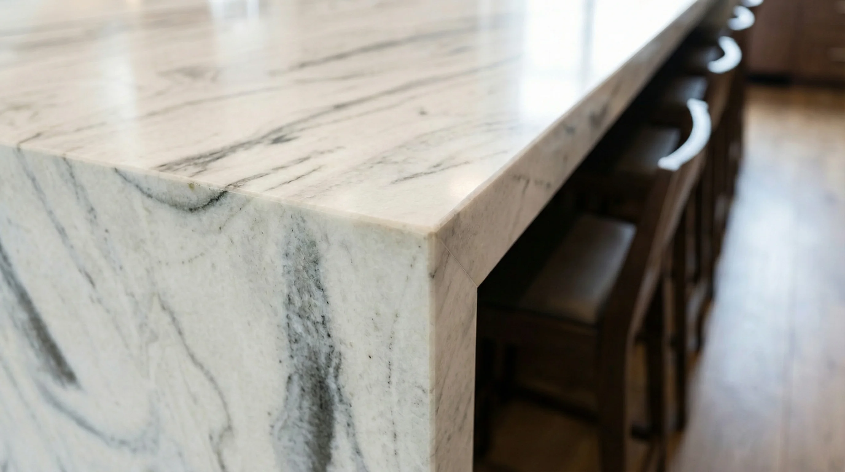 Это изделие завораживает динамичным переплетением холодных жемчужных оттенков и глубоких графитовых жил, напоминающих застывший поток в северном океане. Плавные линии рисунка создают ощущение непрерывного движения и визуальной глубины, превращая рабочую поверхность в центральный элемент интерьера, подчеркивающий безупречный вкус и статус владельца.