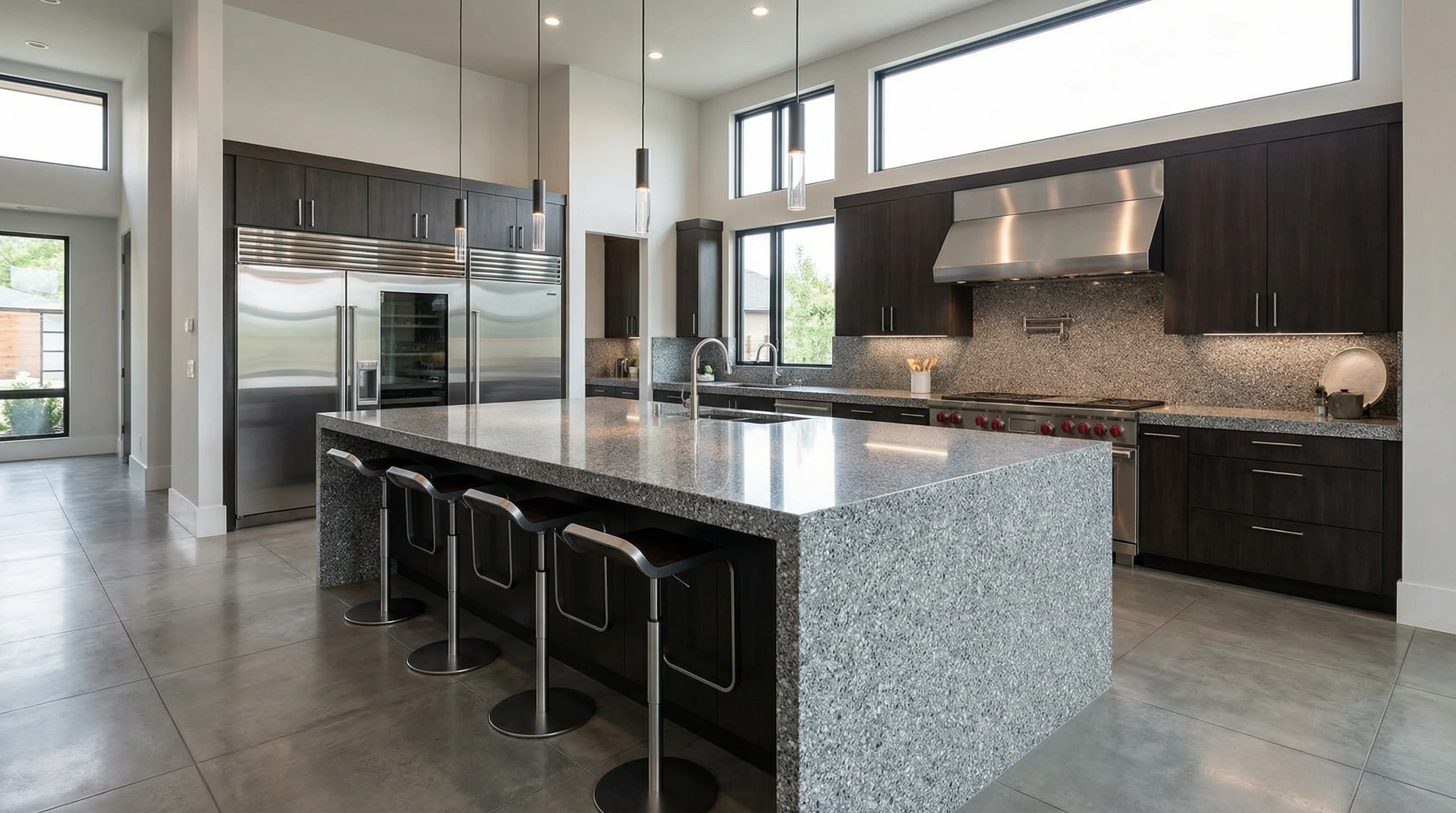 Эта поверхность воплощает собой гармонию холодного блеска и глубокой текстуры. Мириады мелких вкраплений создают уникальный визуальный ритм, напоминающий россыпь драгоценной пыли на благородном металле. Тщательно проработанная фактура не просто притягивает взгляд, но и оживает под лучами направленного света, наполняя интерьер сдержанным, но уверенным величием.