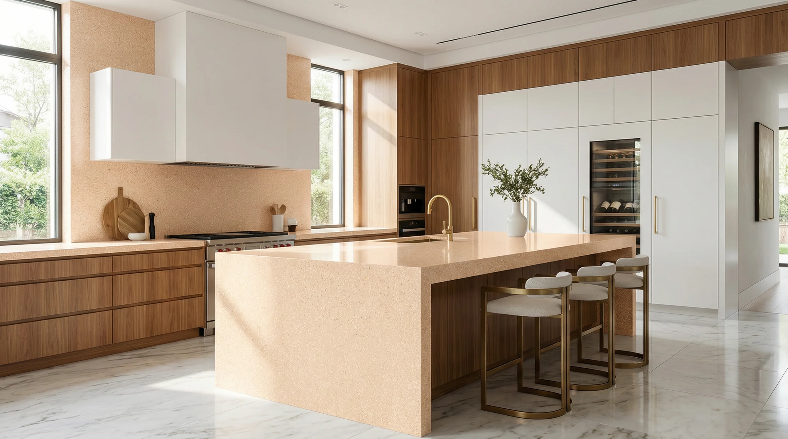 Материал обладает исключительной плотностью и износостойкостью, что делает его идеальным выбором для современной кухни. Поверхность абсолютно не впитывает влагу и устойчива к появлению пятен, сохраняя первозданный вид десятилетиями. Такое сочетание надежности и эстетики подчеркивает высокий статус интерьера и практичный подход к выбору долговечных решений.