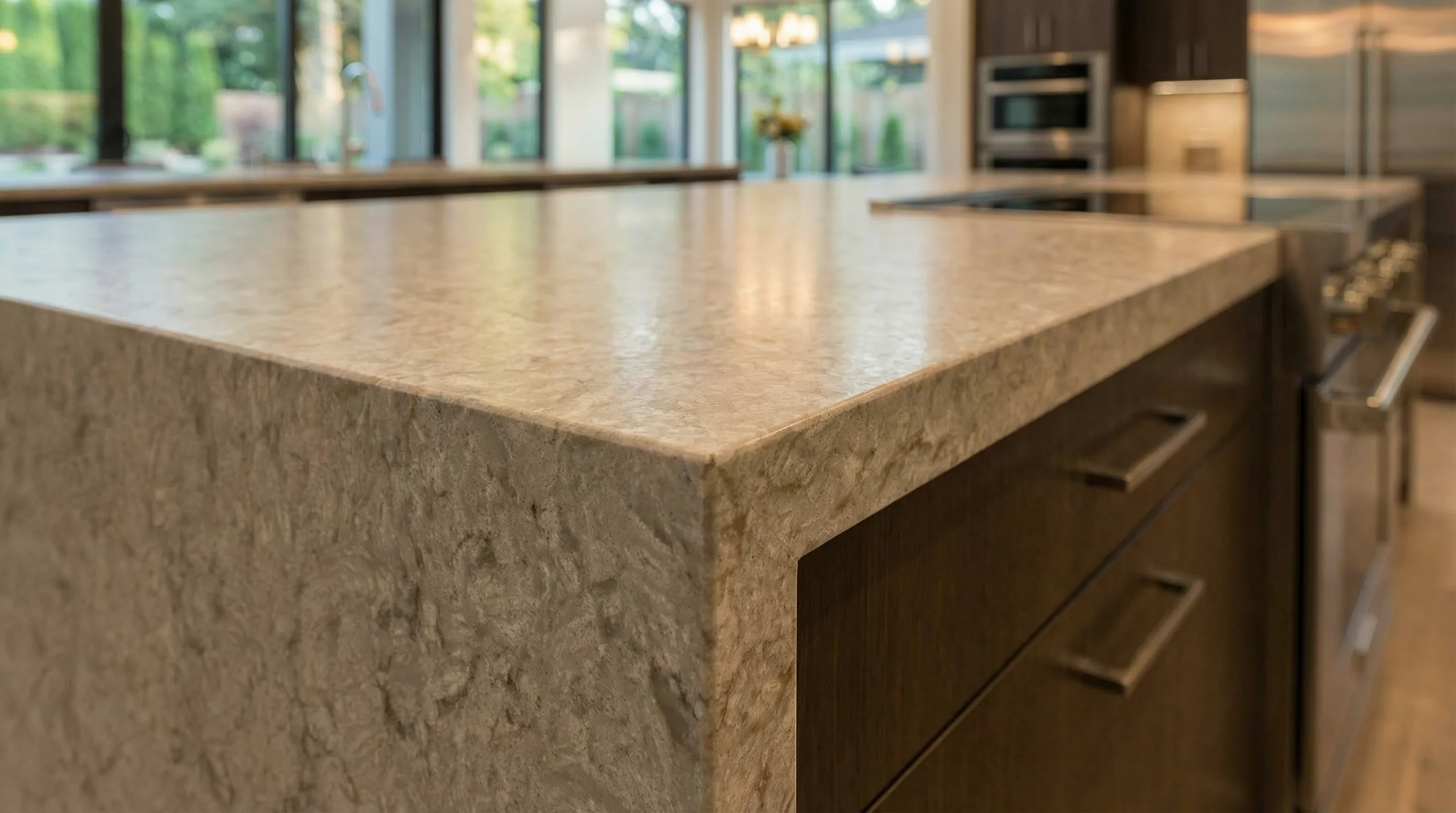 Поверхность этого изделия завораживает мягкой палитрой теплых бежевых оттенков, напоминающих залитые солнцем античные колонны. Сложная текстура с деликатными переходами и едва уловимыми вкраплениями создает визуальную глубину, превращая рабочую зону в центральный элемент интерьера. Каждый фрагмент рисунка уникален, словно запечатленная в материале история, которая наполняет пространство атмосферой спокойствия и благородства.